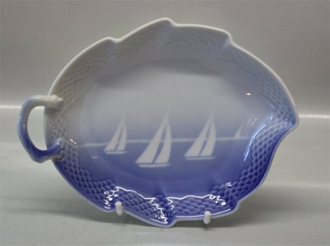 Description: Bing and Grondahl 199 Leaf shaped dish, (large) 25 cm (357) Blue Tone with sailship - marine Marked with the three Royal Towers of Copenhagen. In mint and nice condition Bing & Groendahl