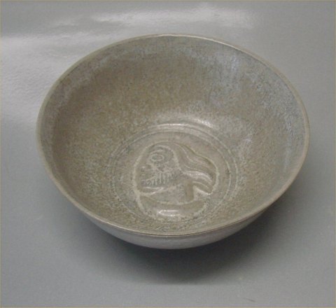 Description: Danish Art Pottery from Saxbo Jais Nielsen Bowl with "ashes" grey glaze 11 x 5 cm Head in relief in the bowl