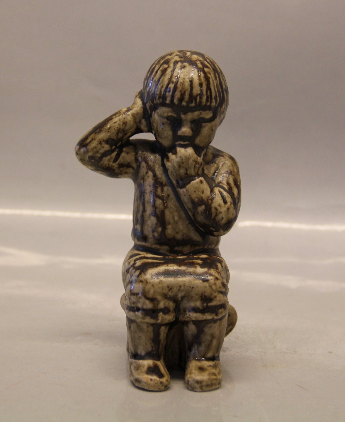 Description: Royal Copenhagen Stoneware 5395 Boy sitting 15 cm Signed JH for Johannes Hedegaard. In nice and mint condition