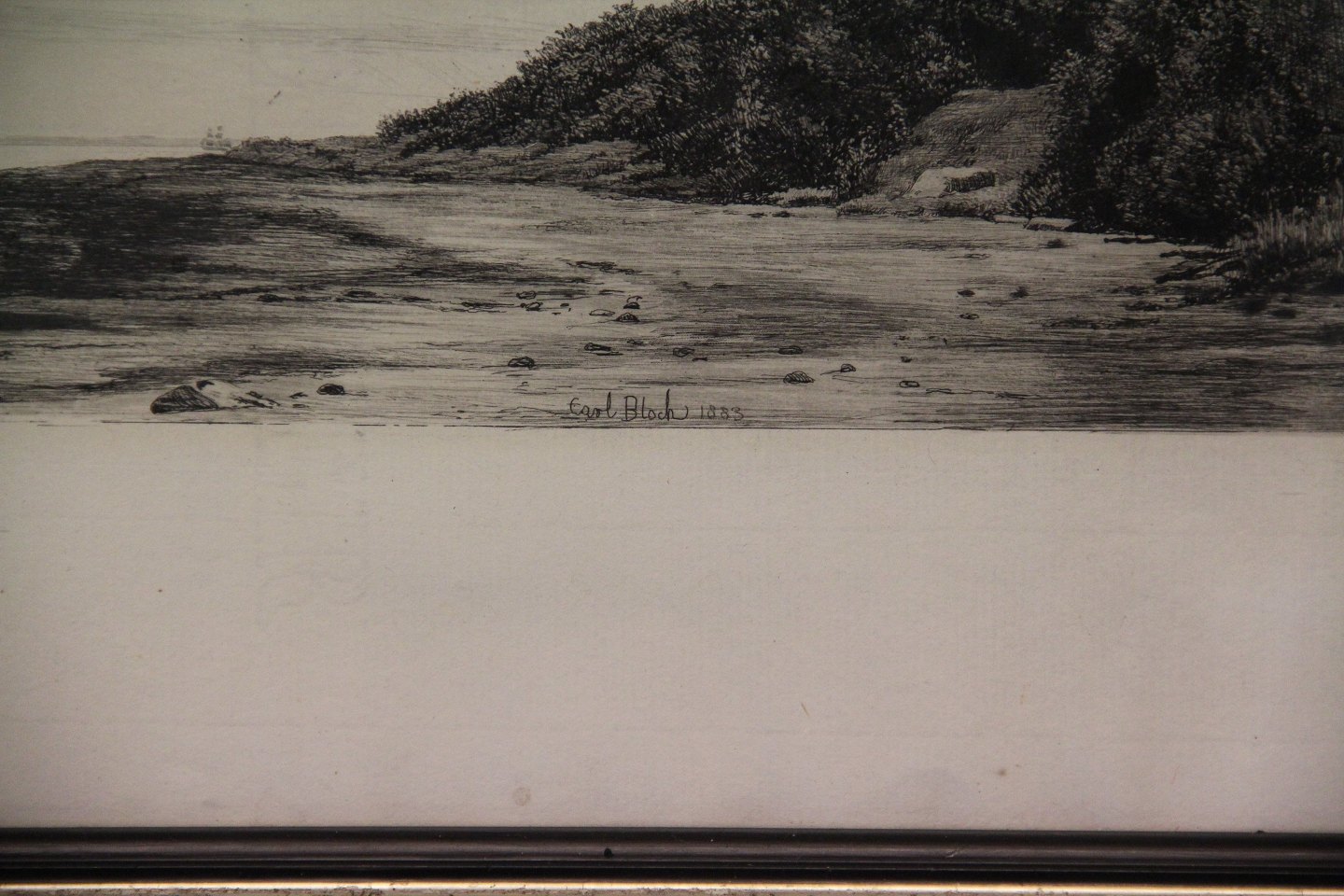 Beskrivelse: Carl Bloch Radering 29 x 40 cm inklusiv gl sort træramme Motiv fra nordsjællandske kyster 1883 Carl Bloch 1883