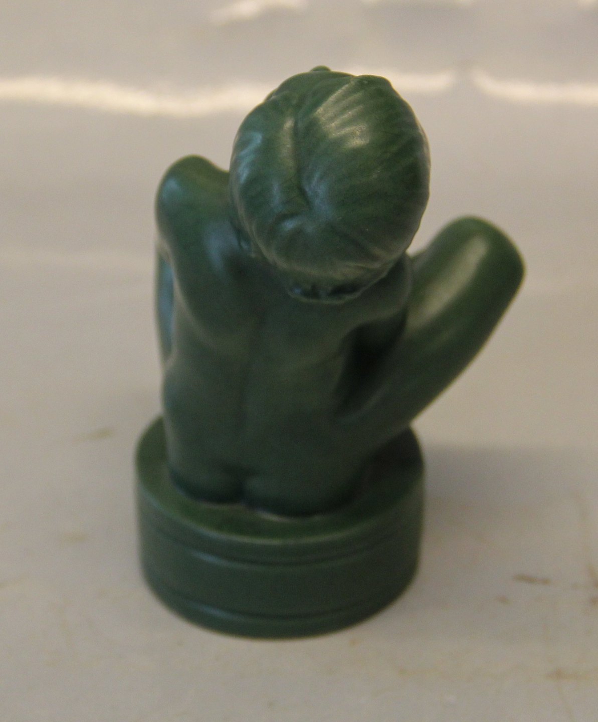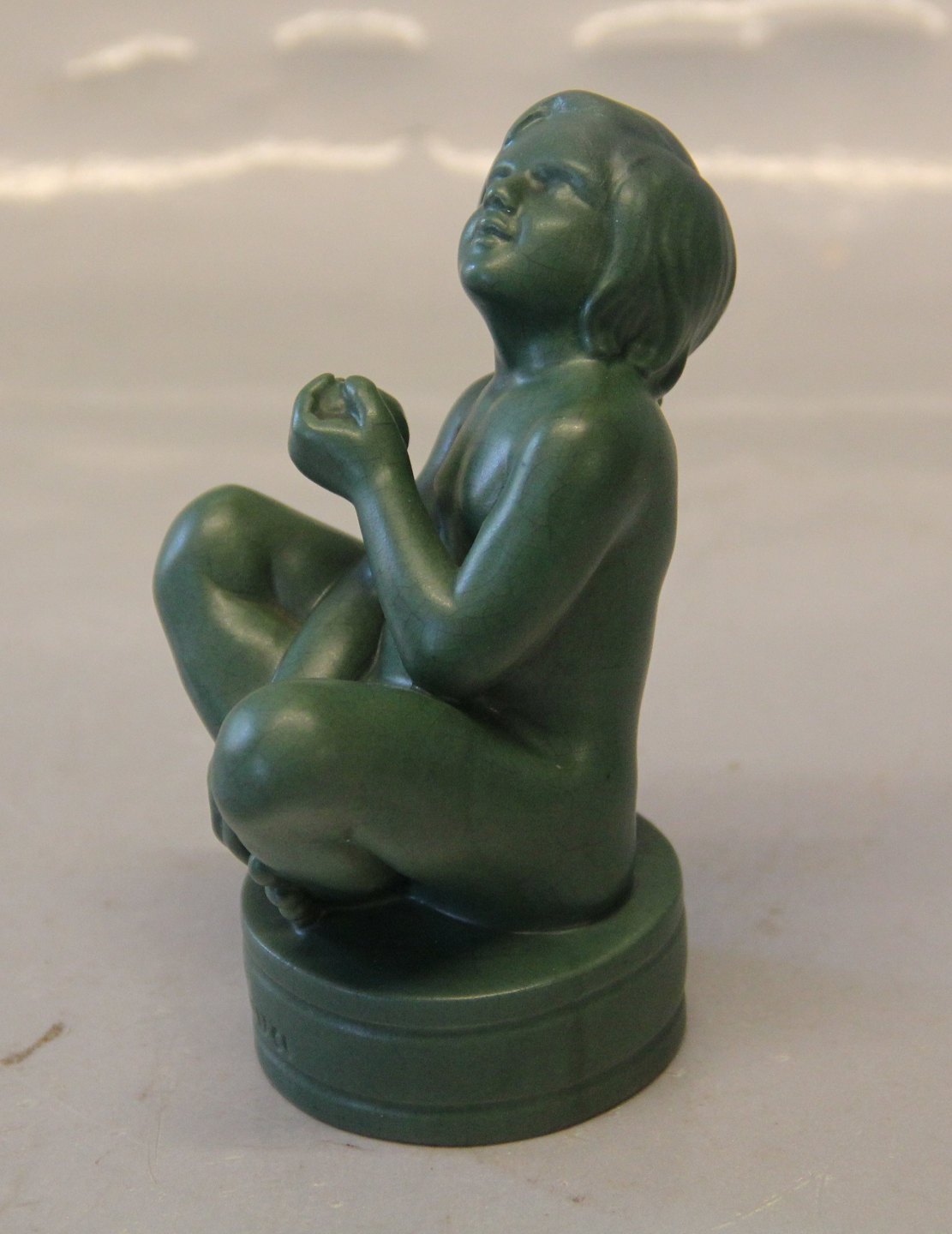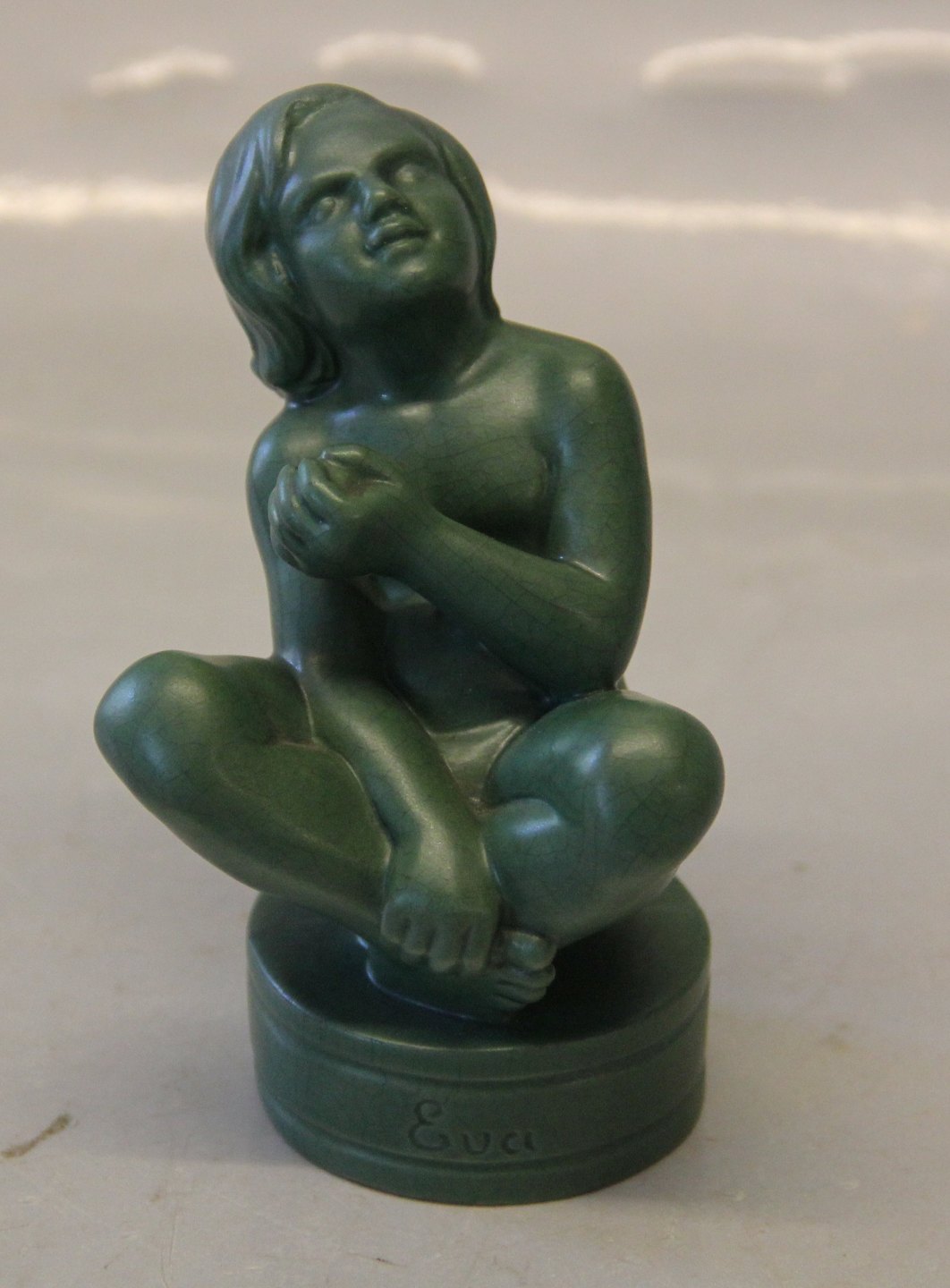 Description: 865 Eve, little girl Axel Sorensen 12 cm Jade Greeen Glaze Ipsen Danish Art Pottery 1843-1955