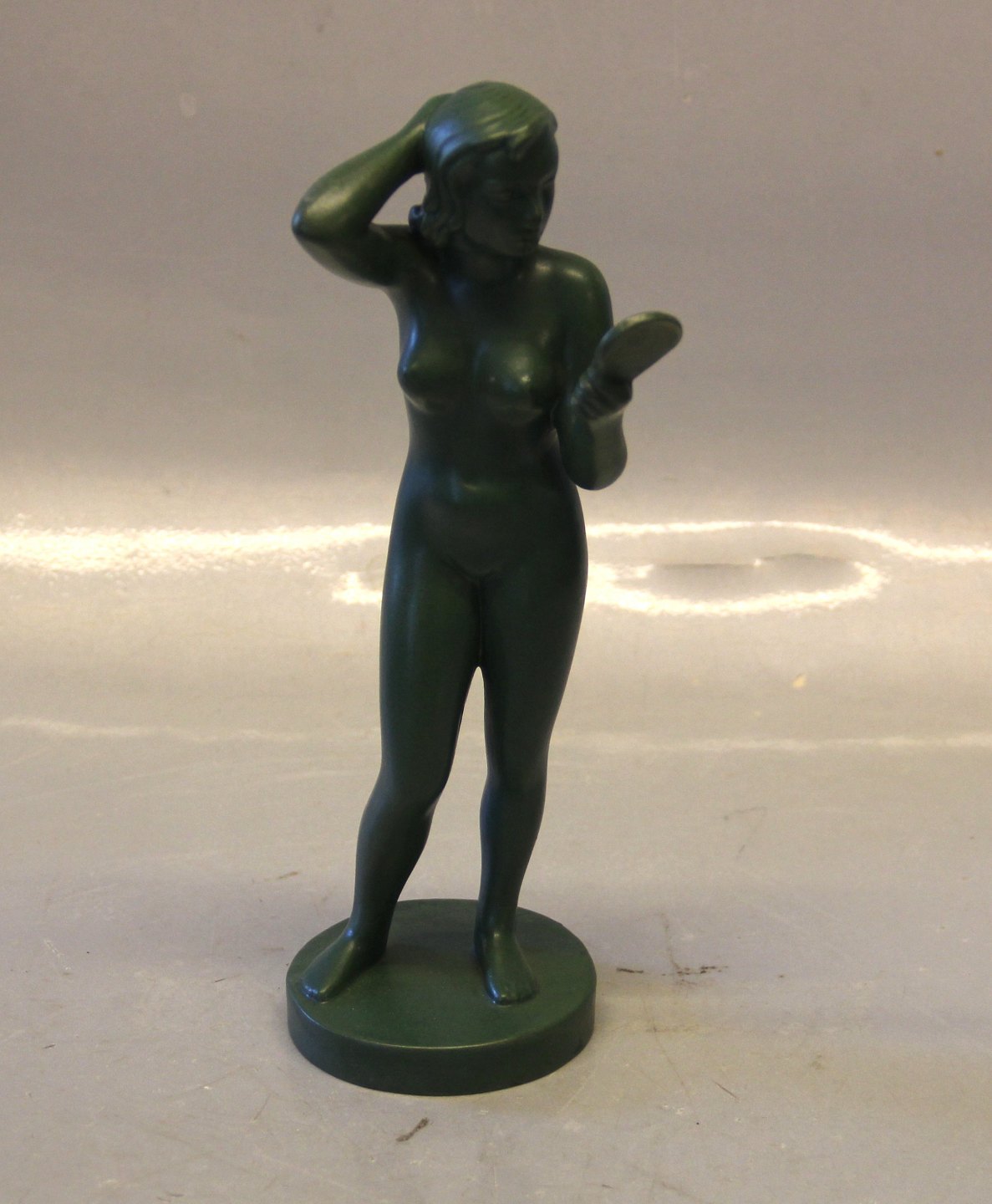Description: 931 V Hand Mirror - Woman with mirror ca 22 cm Volmer Bahner 1941 Jade Green Ipsen Danish Art Pottery 1843-1955
