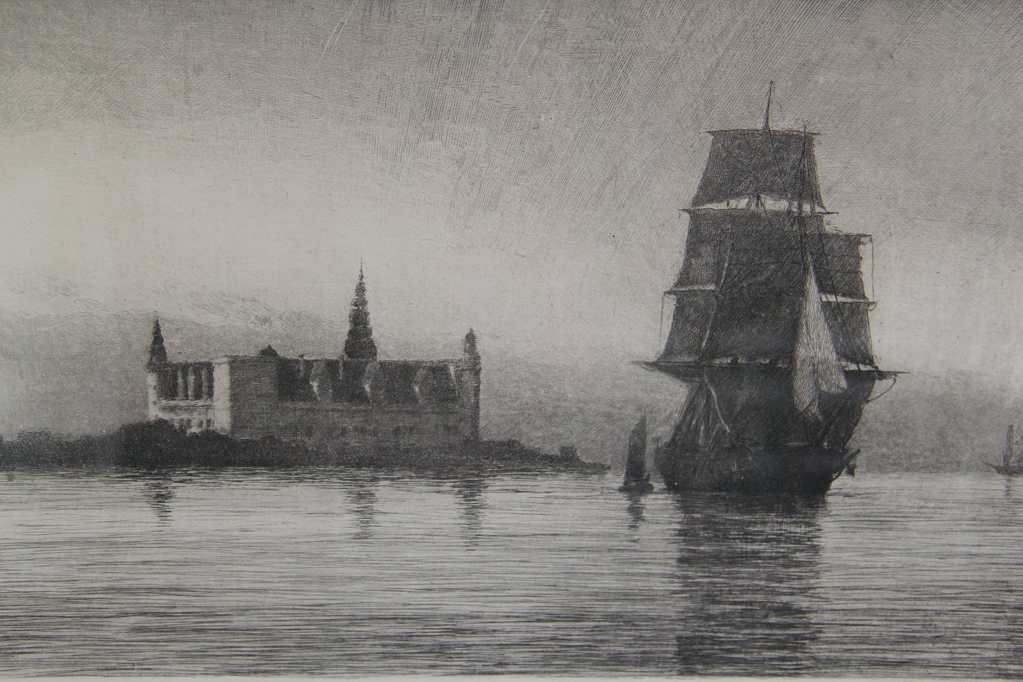 Etching: Carl Locher 1899 Marine - sailships outside Kronborg 32 x 45 cm inclluding old frame