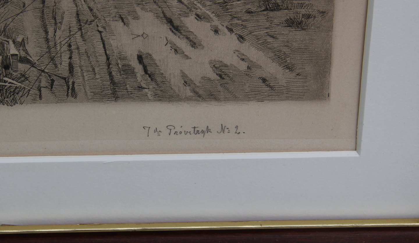 Description: Peter Moensted Etching : Peder Mønsted 1900 Landscabe Test Print nr 2 53 x 42.5 cm including wooden frame