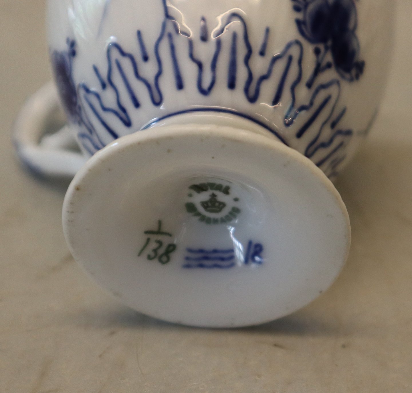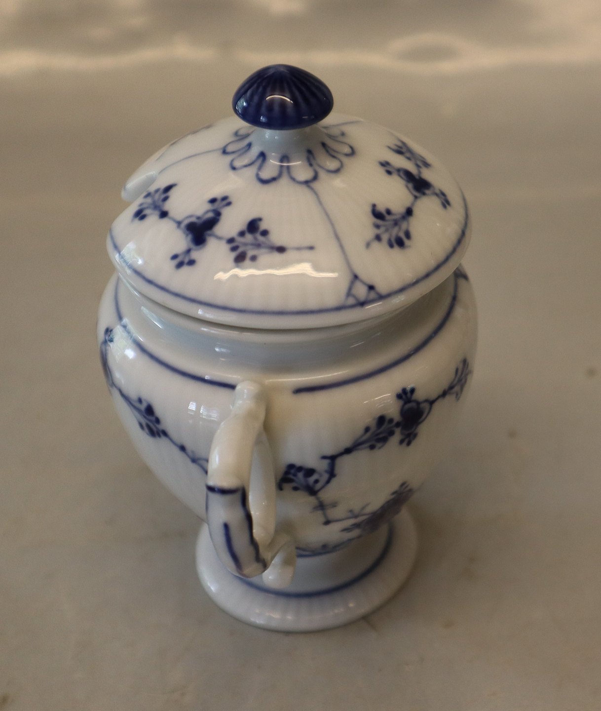 138-1 Sennepskrukke med låg 11.5 cm før 1923 Royal Copenhagen Musselmalet riflet . Muselmalet I fin og hel stand. Passer godt sammen med andre blåmalede spise- og kaffestel