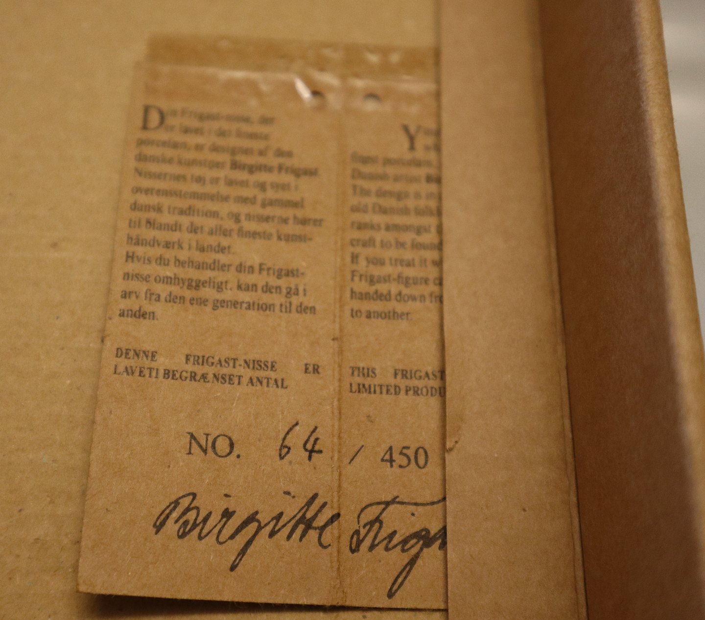Beskrivelse: Nissepige med fugl 27 cm Birgitte Frigast i original boks Begrænset oplag No 64 af 450