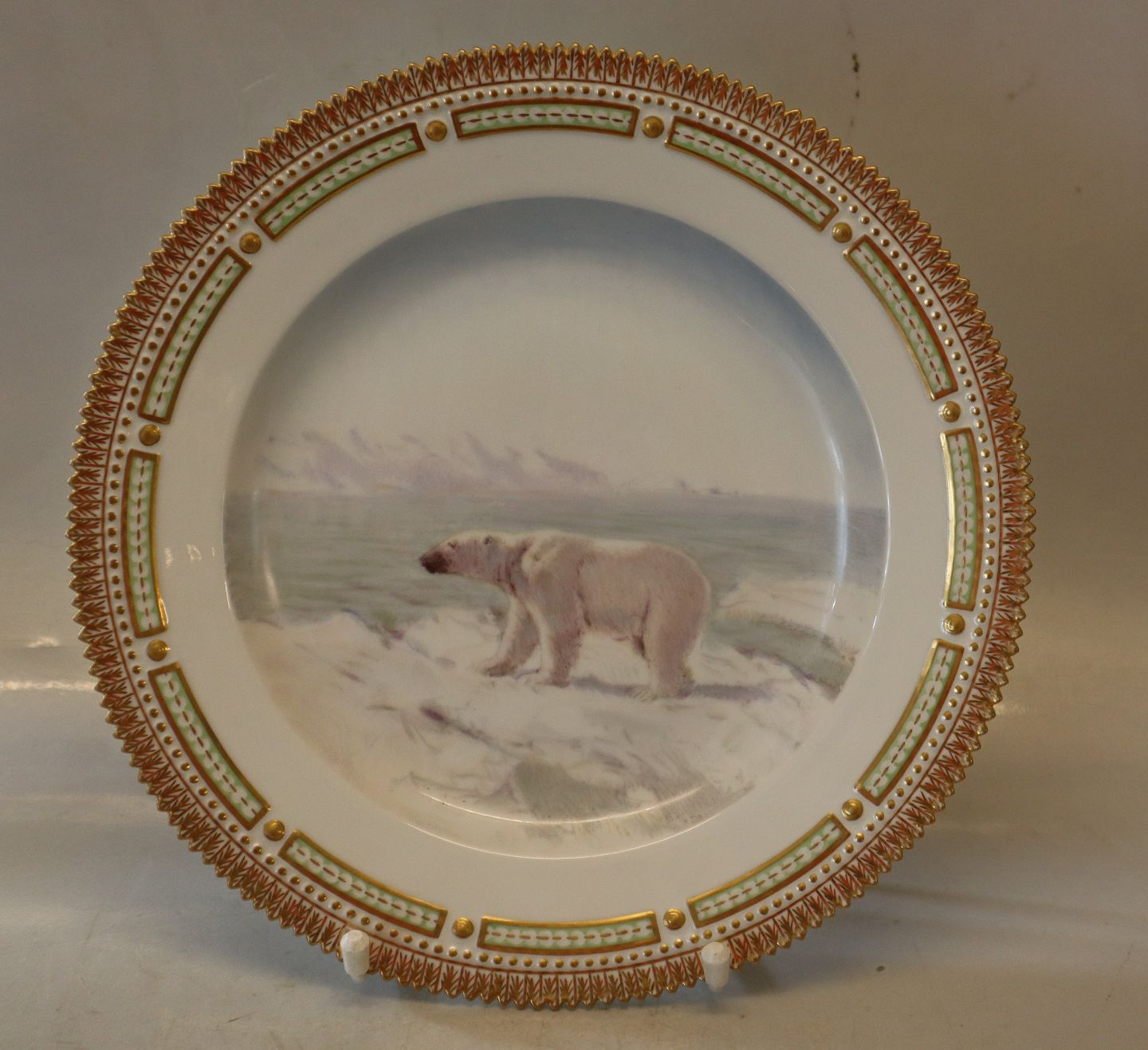 Beskrivelse: 239-3549 "Thalarctos maritimus", - Isbjørn 25,5 cm, jagtplatte på middagstallerken, Fauna Danica 1. sortering (1962) Royal Copenhagen Fauna Danica dyremotiver på guldbelagt perlestel. 1. sortering i fin og hel stand Kongelig Dansk Porcelæn Flora Danica
