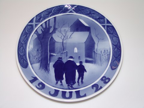 Beskrivelse: Royal Copenhagen Juleplatte (Kongelig, kgl) fra 1928 "Prøst på vej til kirke". Designed af Gotfred Rode. I fin og hel stand. Første sortering.