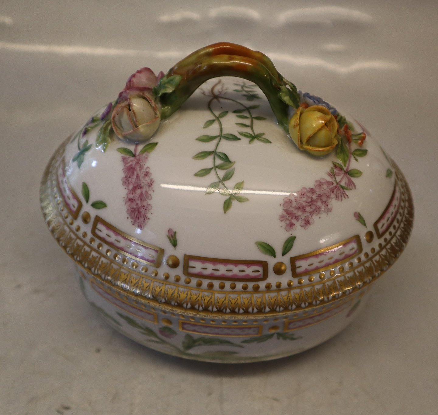 Description: 20-3582 Small Tureen / Sugar bowl 15 x 16 cm Royal Copenhagen Flora Danica Floral decoration on pearl pattern with gold rim. Factory first and in nice and mint condition