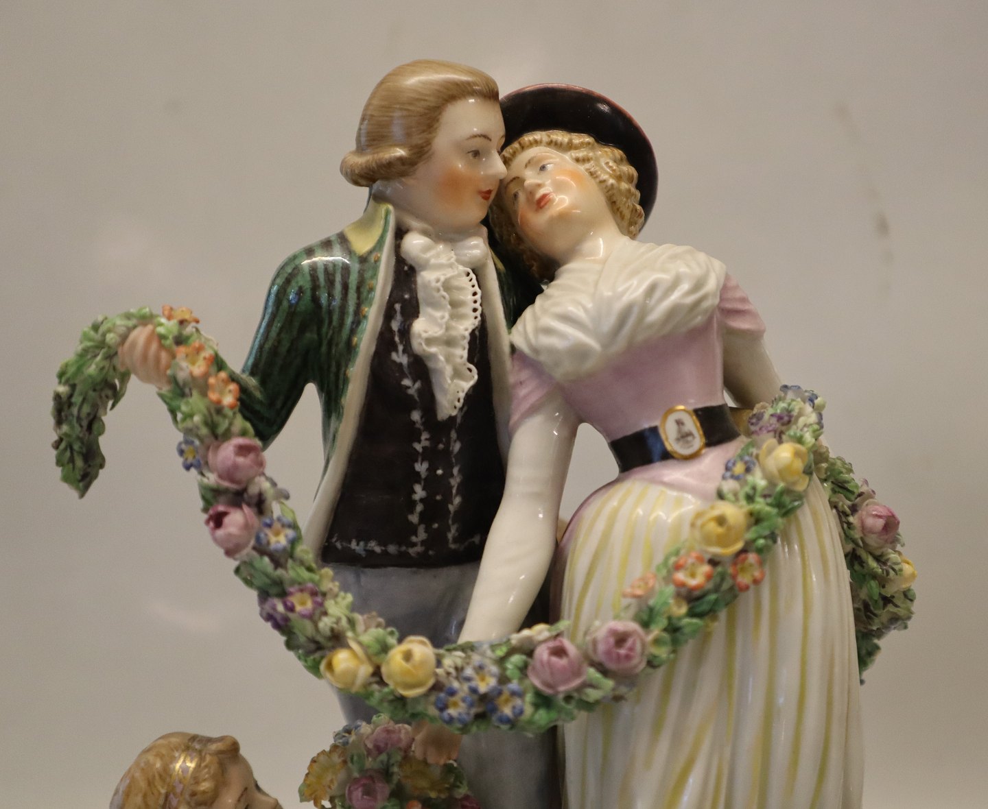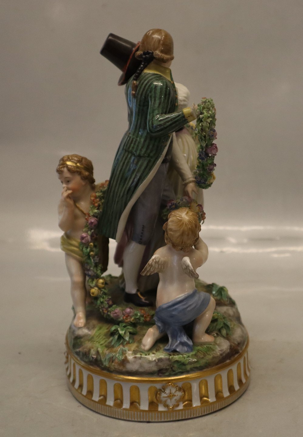 Beskrivelse: 12154 Kgl. Kærlighedsgruppe: Victoriansk par med cupido´er 24 x 17 cm blomsterguirlander med pousserende blomster fra Royal Copenhagen I hel og fin stand Stemplet med Juliane Marie mærket