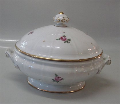 Beskrivelse: Bing & Grøndahl Roselil 005 Terrin 28 x 18 cm 005 Lågfad 1,5 l. (512) Hvidt kantet porcelæn med bred guldkant og strøblomster i Henriette stil. Bing & Groendahl mønster på samme form som Offenbach I hel og fin stand