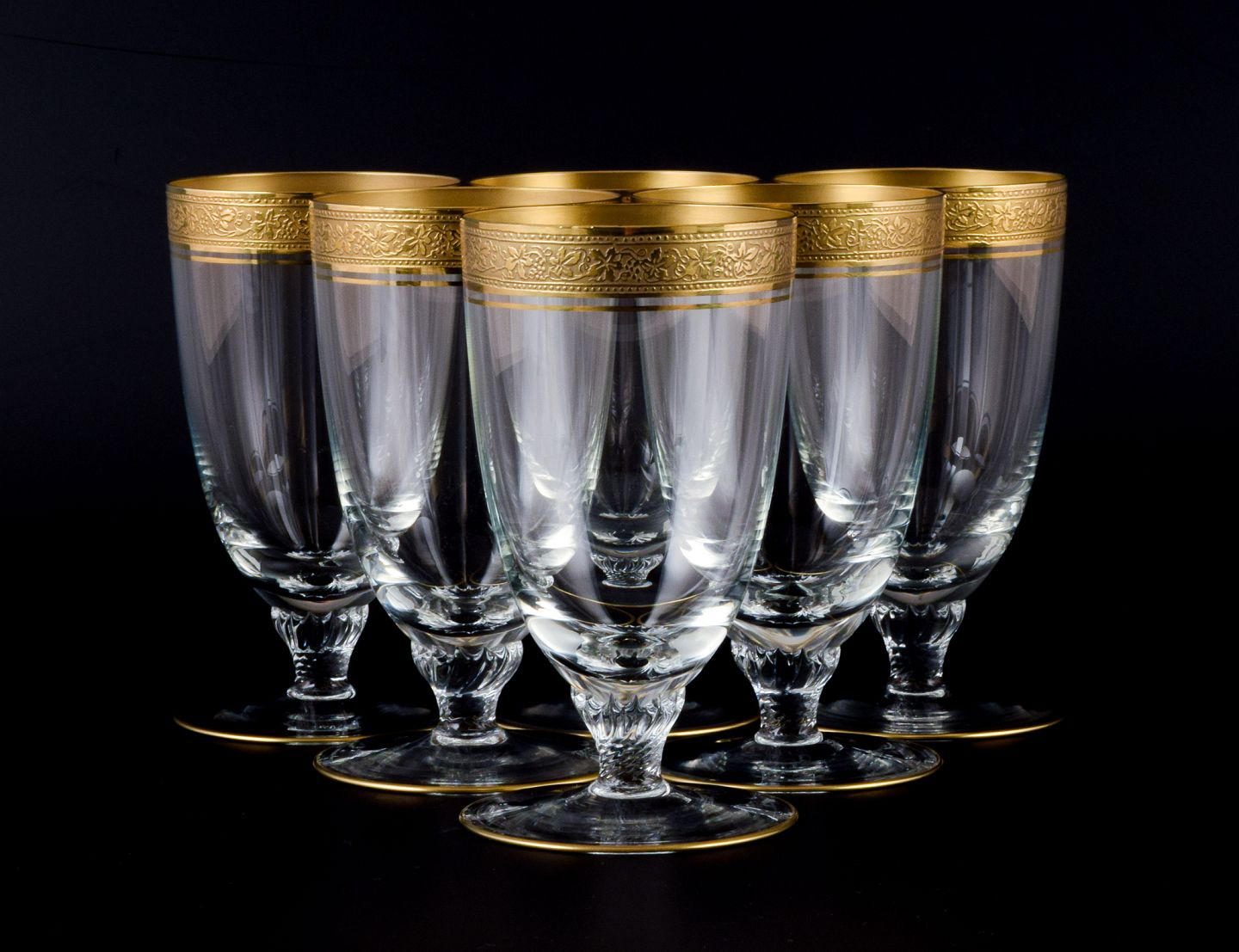 Rimpler Kristall, Zwiesel, Germany, six hand blown crystal drinking glasses with gold rim decorated with grapes and vine leaves.