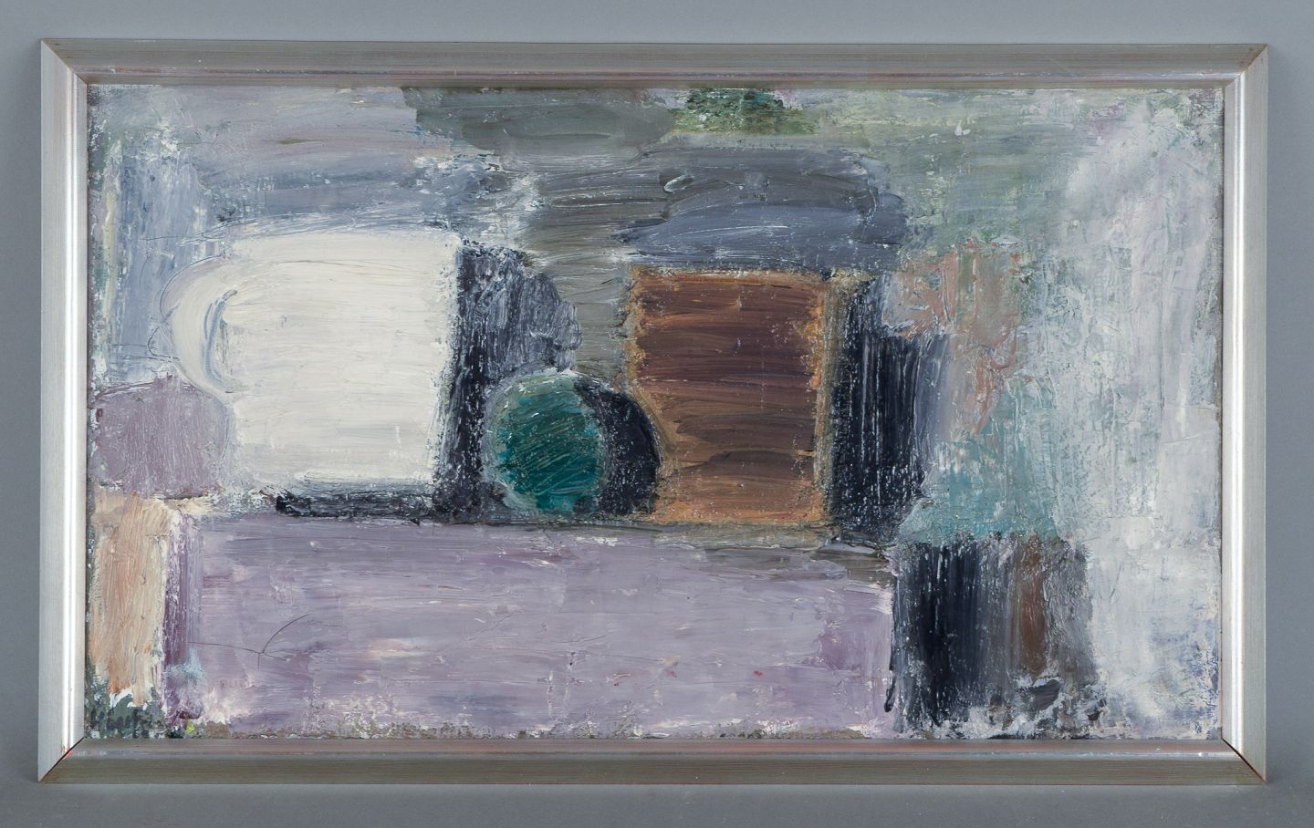 Kjell Högström (1930-2012) , Swedish artist. Modernist still life. Mid-20th century. Signed. Exhibition label on the back. Overall dimensions: W 76.0 cm x H 46.0 cm.