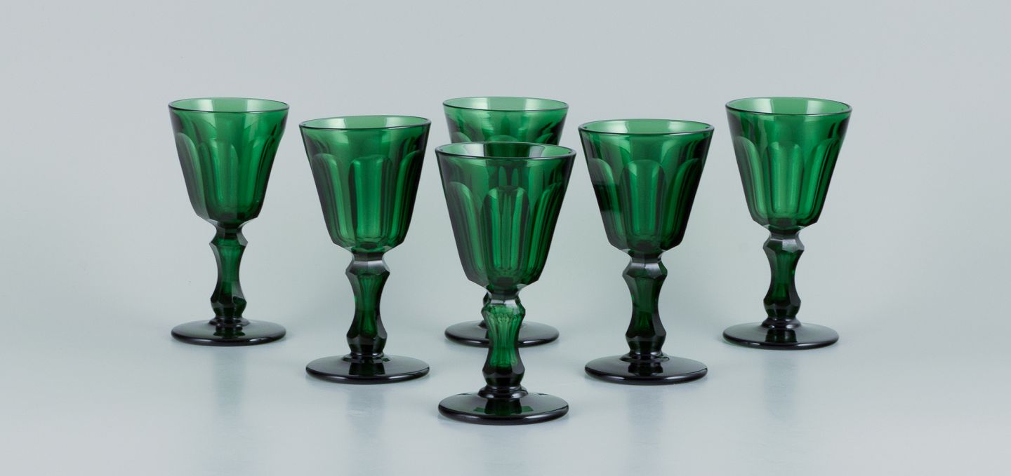 Val St. Lambert, Belgium, a set of six "Lalaing" white wine glasses in green crystal glass, faceted cut.