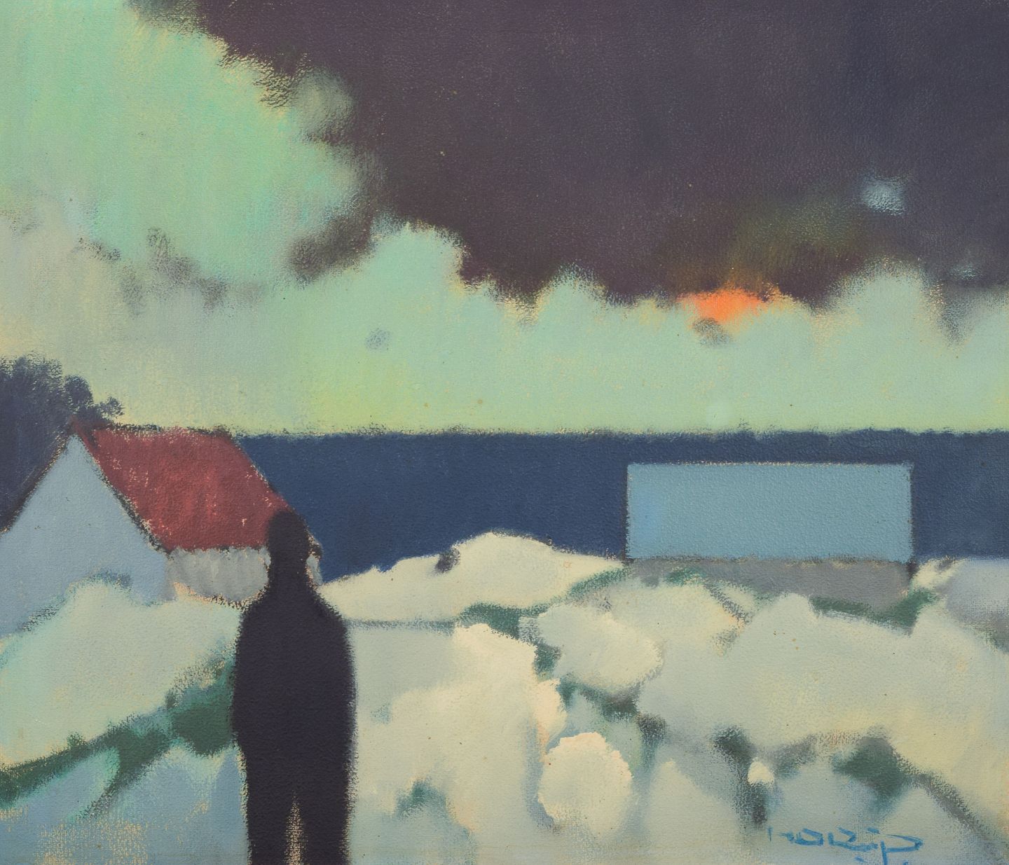 Knud Horup (1926-1973), Danish artist, oil on canvas. Figure in landscape. Mid-20th century. Signed. In perfect condition. Dimensions: 70 cm x 60 cm. Total with frame: 86 cm x 76 cm.