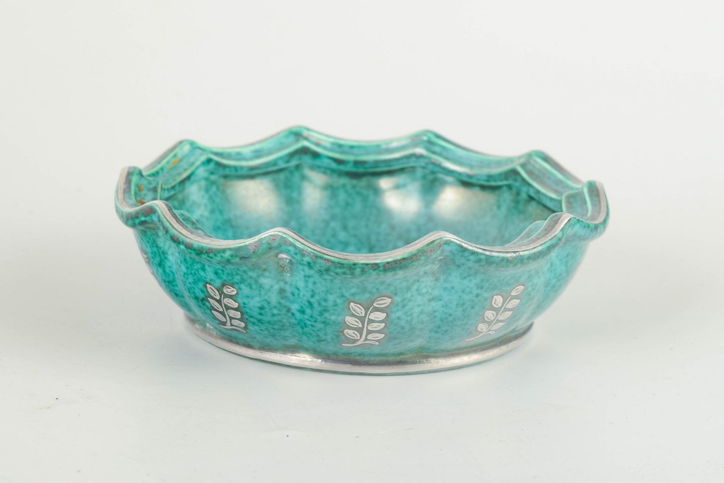 Low round bowl in turquoise-glazed stoneware with silver inlays along the sides and in the bottom. Slightly undulating, press-moulded rim.