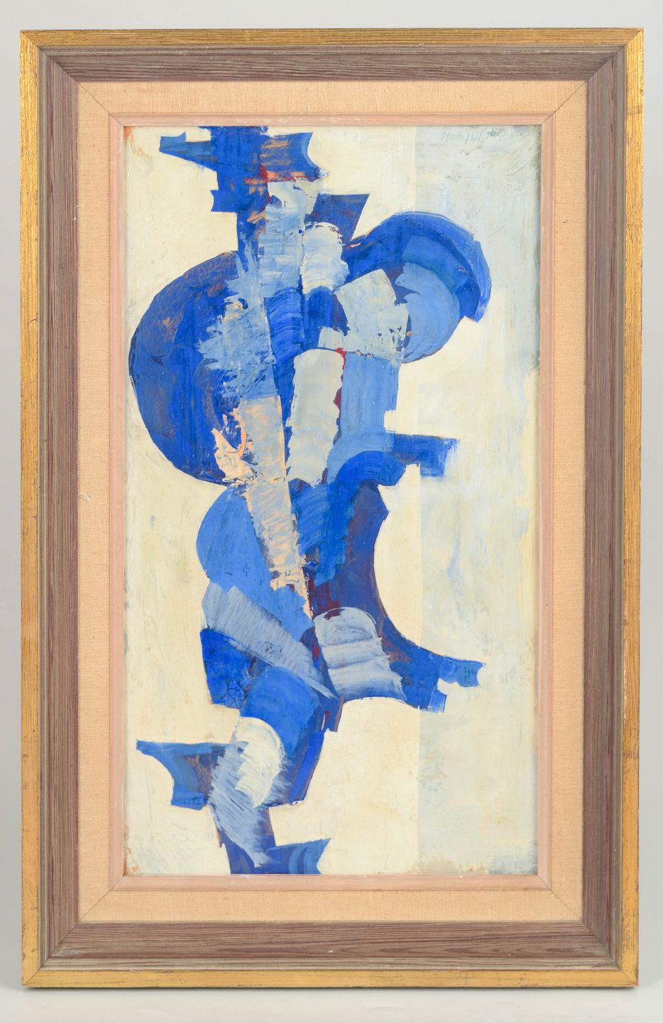 Abstract modernist composition in oil on board with dynamic, layered brushwork in blue and white tones, signed and presented in a frame.