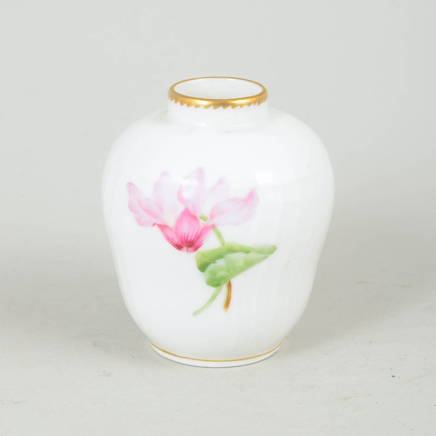 Hand-painted porcelain vase decorated with Saxon flower motif on white glaze, finished with gilded rim at the neck and foot.