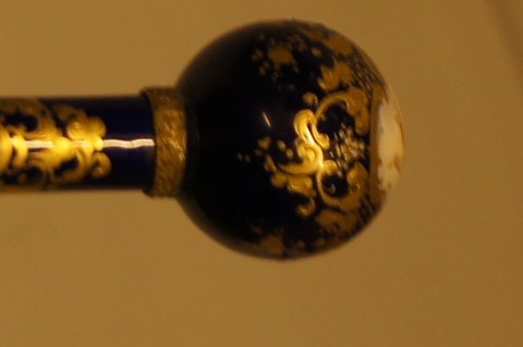 Porcelæns-stok ca. 1890, sandsynligvis Meissen, malet med amoriner, rige kobolt farver, forgyldte metal kraver, palisander skaft.