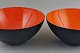Her tilbydes en rød og en orange stor Krenit frugtskål af Herbert Krenchel. Sort metal og rød og orange emalje. 1970'erne.