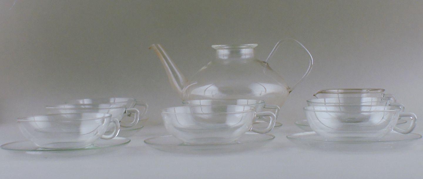 Wilhelm Wagenfeld: "Jena". Thestel af klart glas bestående af 1 L. thekande, 7 thekopper med underkopper og flødekande. Mrk. Jenaer Glas. I god stand. Thekande 24 cm. lang og 13 cm høj.