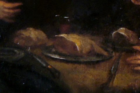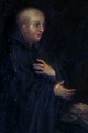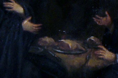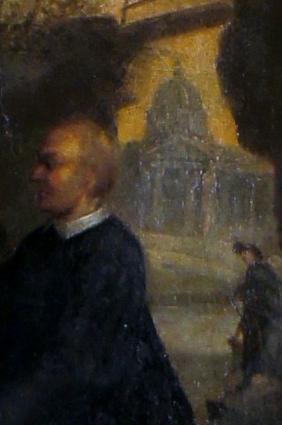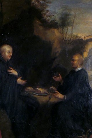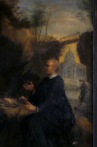 18 c. Italian Old Master. 2 monks eating lunch, cathedral in the background. Painting of high quality. Oil on canvas. 51 x 65 cm. The black antique wooden frame is 7 cm. wide and in good condition. In good condition, some crazing, needs cleaning, relined. Painting of high quality. Oil on canvas. 51 x 65 cm. The black antique wooden frame is 7 cm. wide and in good condition. In good condition, some crazing, needs cleaning, relined.