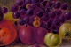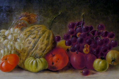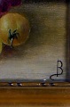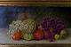 Oil on canvas, still life with fruit and vegetables. Approximately 1900. Monogram "B". Unknown painter. In good condition, canvas measuring 51x26 cm. The gold frame is 6 cm. wide and in good condition.