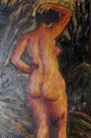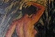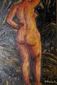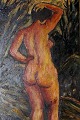 Olie på plade, portræt af nøgen kvinde, utydeligt signeret, ubekendt kunstner. Ca. 1920. Måler 23x41 cm. Rammen er 3 cm. bred.