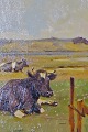 Gunnar Bundgaard (f. Aalborg 1920, d. 2005) : Køer på marken. Signeret, G. Bundgaard. Olie på lærred. 80 x 63. I god stand. Guldrammen er 10 cm. bred.