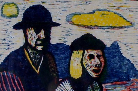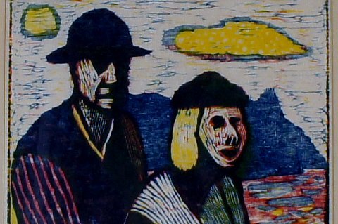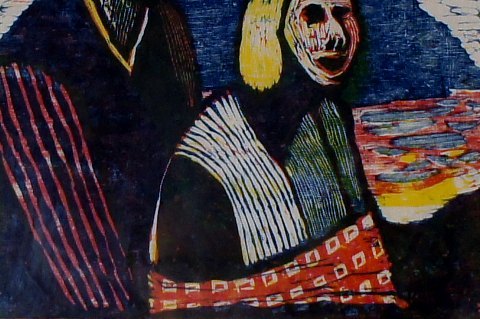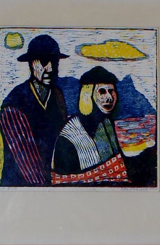 Seppo Mattinen (født 1930) Litografi i farver af par i landskab. 4/15 E.T, dateret 1959. Måler 31 x 31 cm. I god stand. Rammen er 2.5 cm. bred og i god stand.