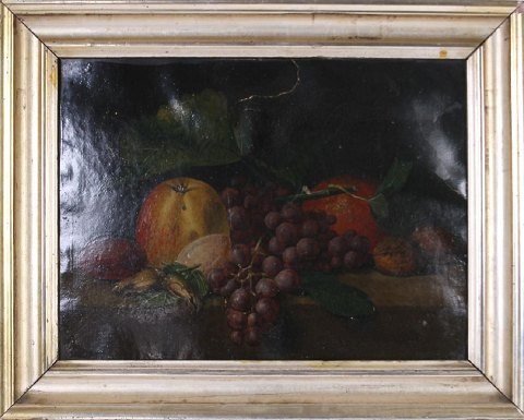 Painting: Still life with fruit, 1800. Oil on cardboard, 24.5 x 33 cm. Inscribed on the back: My Gift for Pastor Zahrtmann from Julie Tommesen. Silver-plated frame. In good condition.