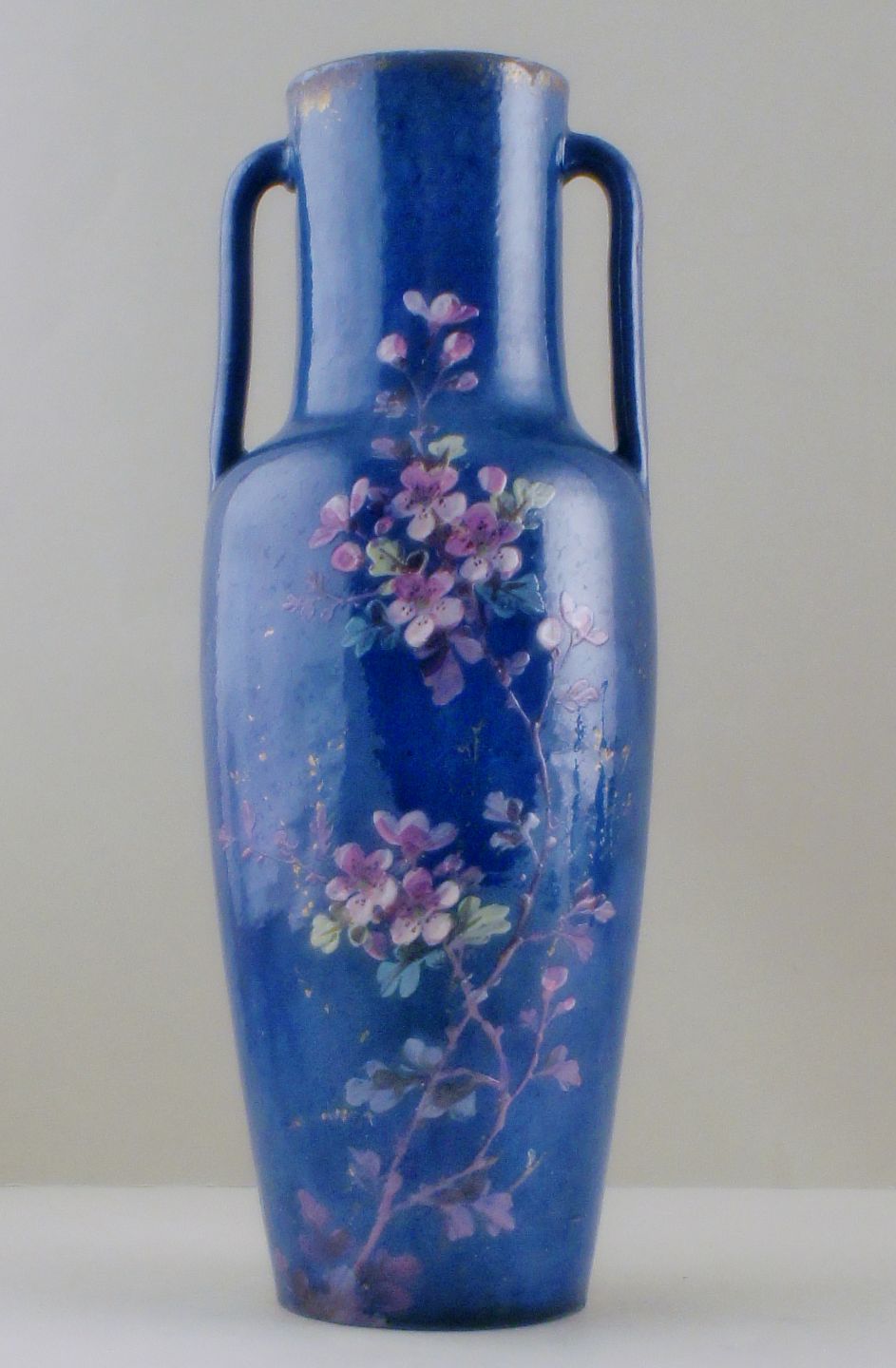Clément Massier og Lucien Lévy-Dhurmer, stor fransk vase i keramik, malet med blomster. Blå glasur. Tidligt 1900 tallet. I god stand. 35.5 cm. høj.