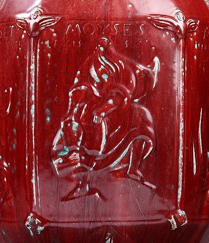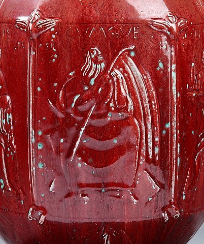Sekssidet korpus med figurrelieffer, med okseblodsfarvet glasur. Royal Copenhagen, signeret Jais og indridset modelnummer 20094. 1930erne. Højde 42 cm.