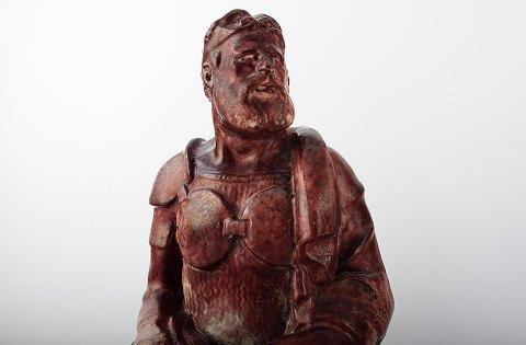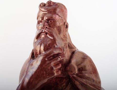 Sjældne Karl Hansen Reistrup for Kähler, ca. 1888. Kriger og konge, bogstøtter i keramik. Hver bogstøtte er stemplet "KHR" og "HAK" på bagsiden. Flot rubinrød lustreglasur. Den røde glasur blev godt modtaget på Verdensudstillingen i Paris i 1889. Meget sjældne skulpturer. 30 cm. høje. I god stand.