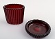 4 dele Josef Frank for Reijmyre, rødt kunstglas, svensk design 1960´erne. Bladformet fad, lille kande, lille bæger, lille skål. I perfekt stand. Fadet måler 19 cm.