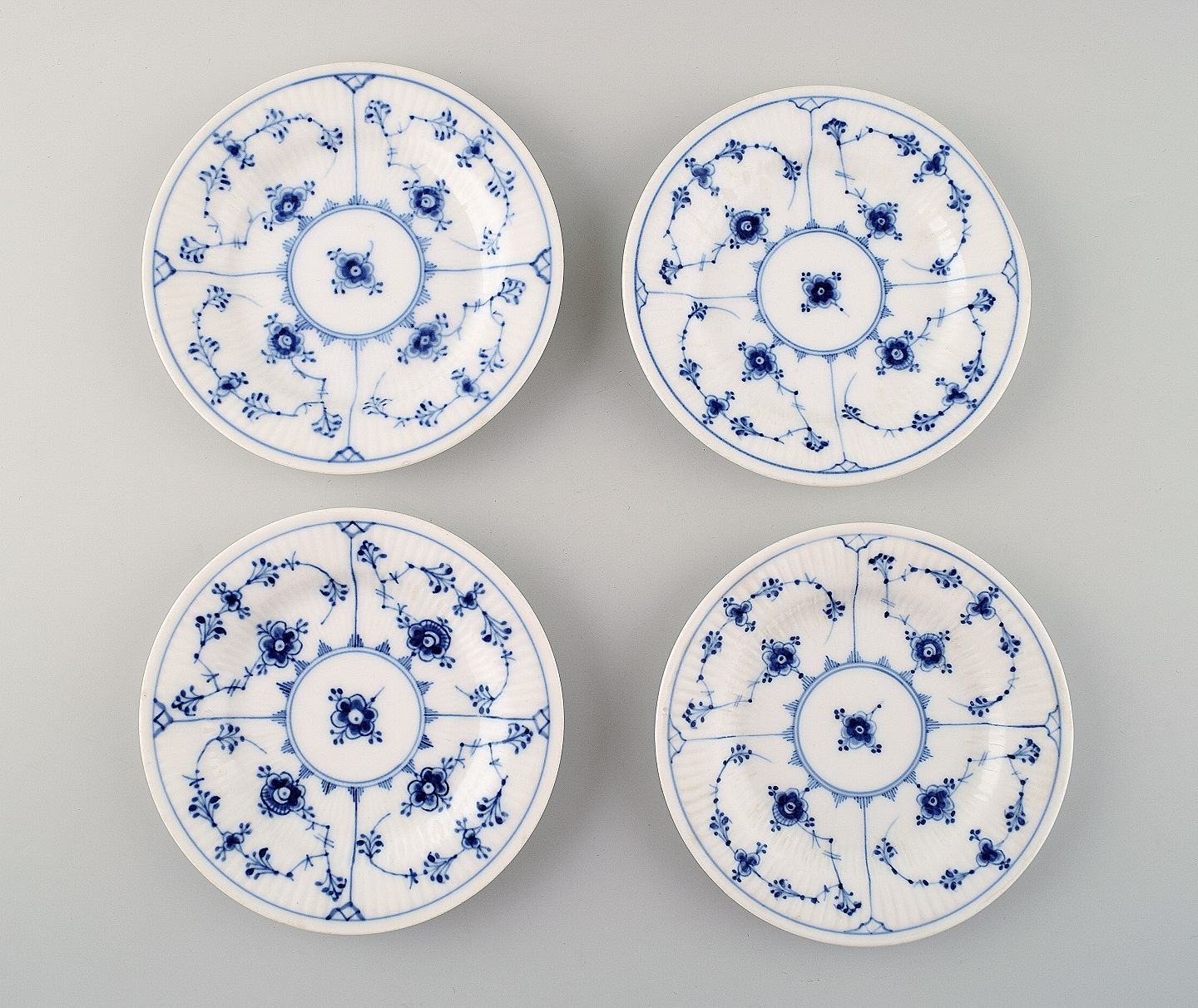 4 Royal Copenhagen Blue fluted cake plates. Number 1/182, 1st. factory quality. One is second factory quality. Diameter 14cm.