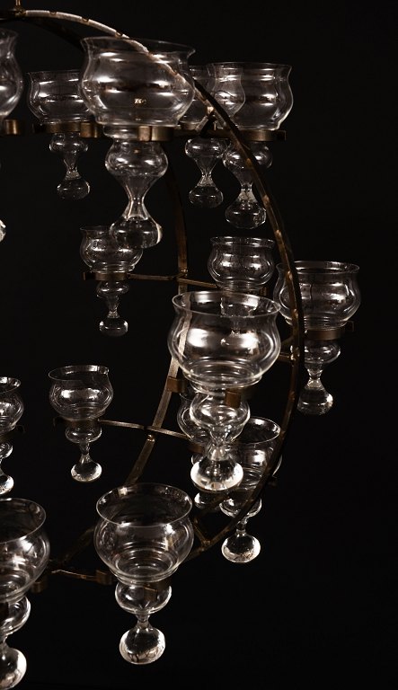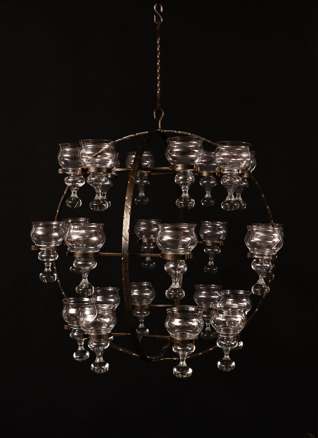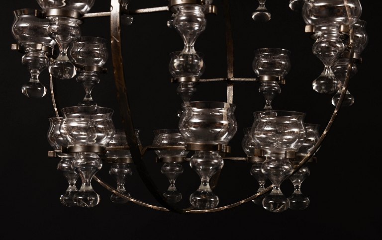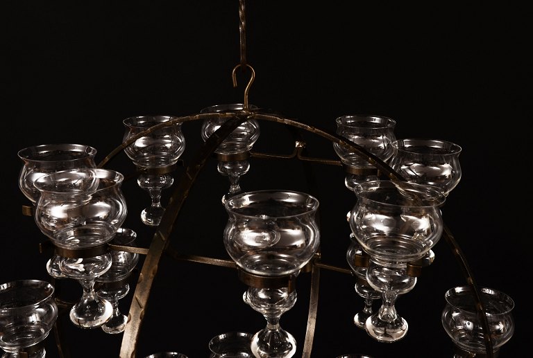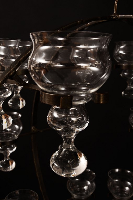 Erik Höglund (1932-1998). Monumental kugleformet loftlampe/lysekrone i smedejern med kunstglaskupler til lys. Svensk design, 60´erne. Diameter 63 cm. I perfekt stand.