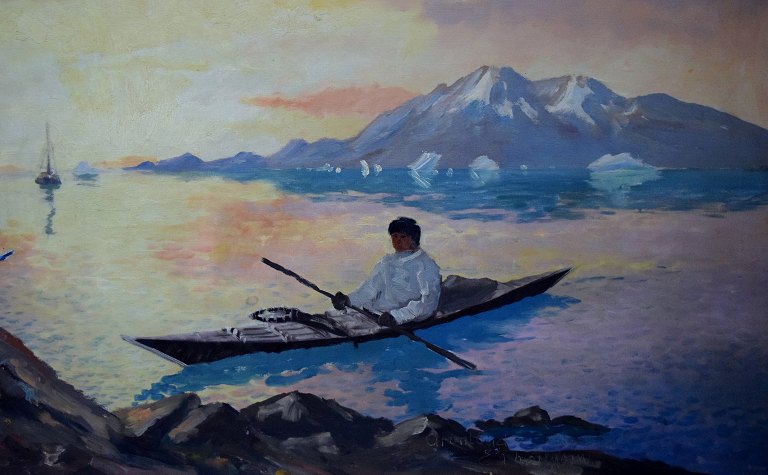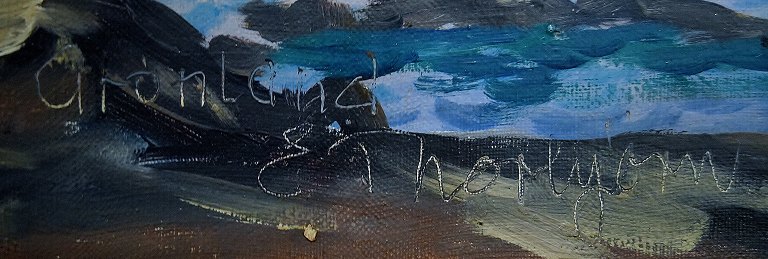 Evelyn Bøje Thorbjørn Andersen: Kystparti fra Grønland. Sign. E. Thorbjørn, Grønland. Olie på lærred. Måler 96 x 65 cm. Rammen måler 4 cm. I perfekt stand.