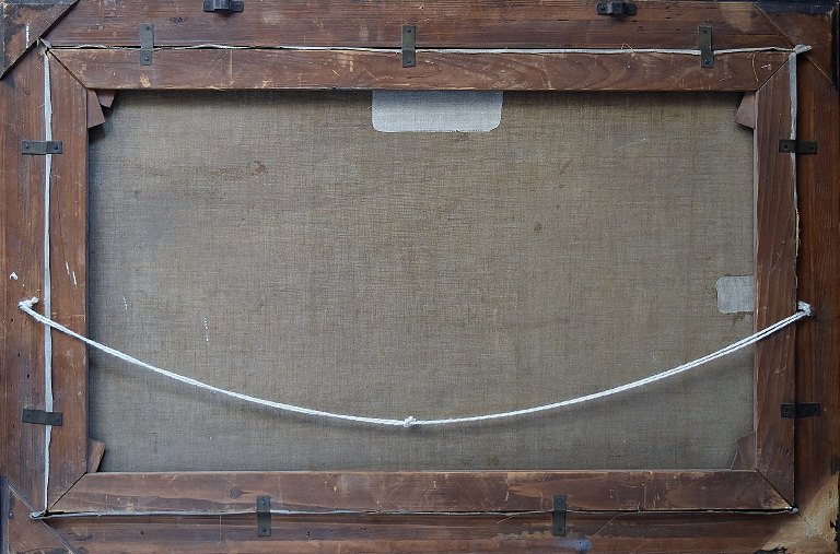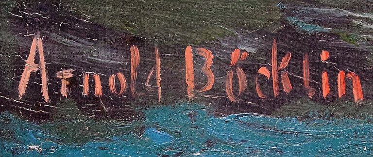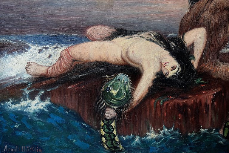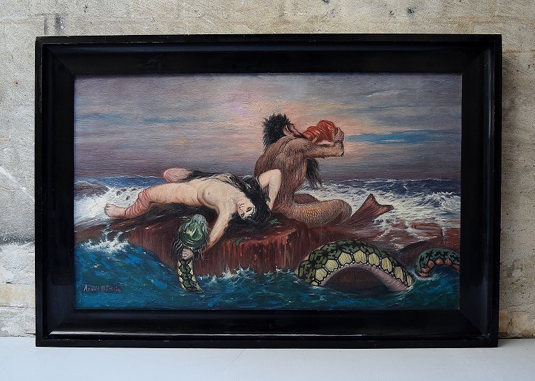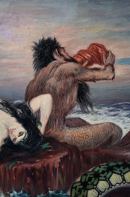 Ubekendt kunstner, efter Böcklin, mytologisk scene med havmand, nøgen kvinde og havvæsen. Olie på lærred.