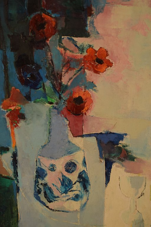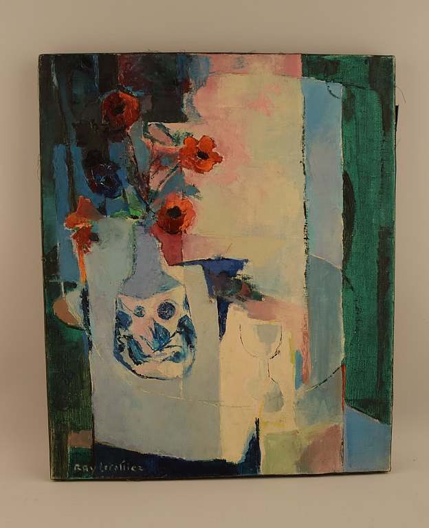 Ray Letellier, fransk kunstner "Les Anémones". Stilleben med blomster i vase og vinglas, olie pĺ lćrred. I god stand. Signeret, ca. 1960´erne. Mĺler 48 x 36 cm. Uden ramme.