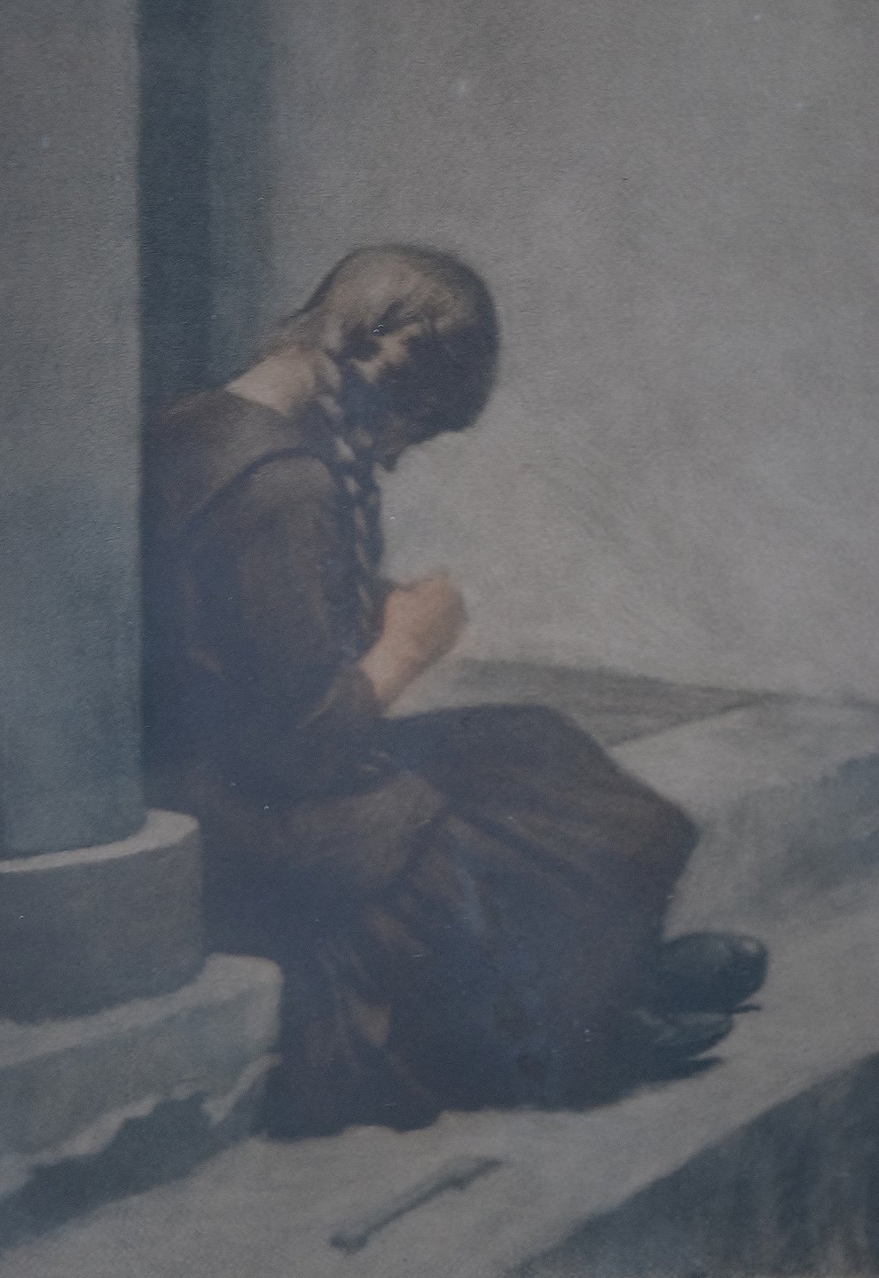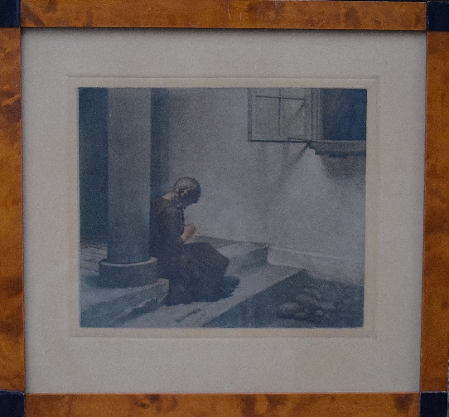Peter Ilsted 1863-1933. Exterior with sitting girl on the stairs. Signed Peter Ilsted. Mezzotinte in color. 23 x 27 cm. Framed. The frame measures 2, 5 cm. In very good condition.