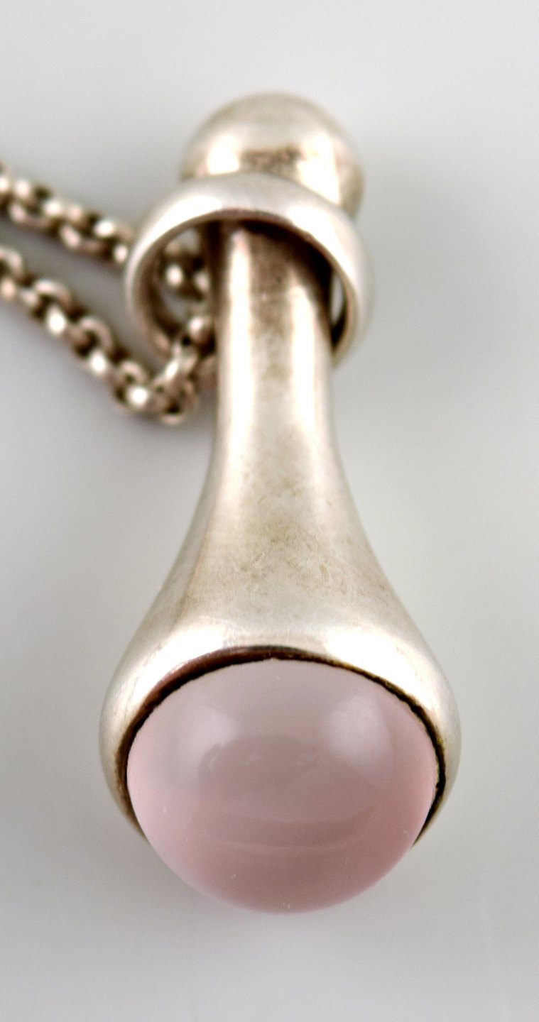 Georg Jensen: Halskæde, model Droplet, af 925 sterlingsølv, prydet med cabochonslebet rosa kvarts. Dessin nr. 453. Længde. ca. 45 cm. I perfekt stand.