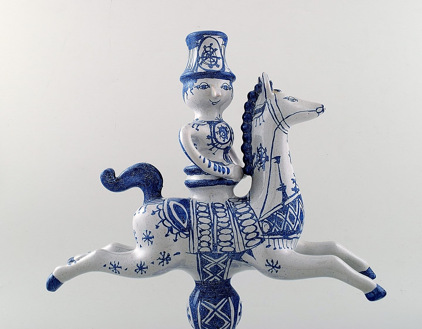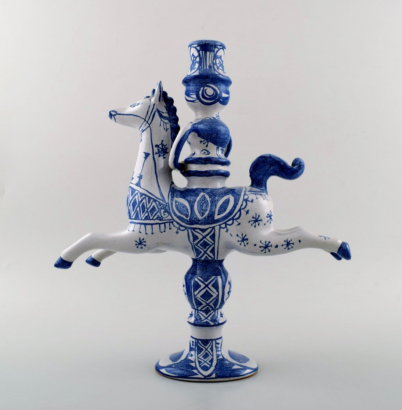 Bjørn Wiinblad keramikfigur fra det blå hus. Figur / lysestage rytter til hest med plads til et lys. Dekorationsnummer L4. Denne er fra 1975. Højde 30 cm., bredde 26 cm. Perfekt stand.