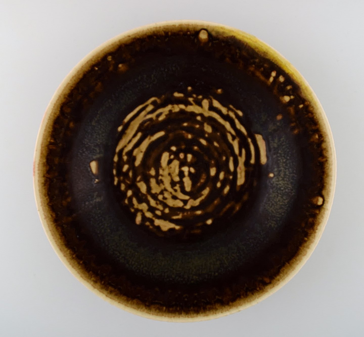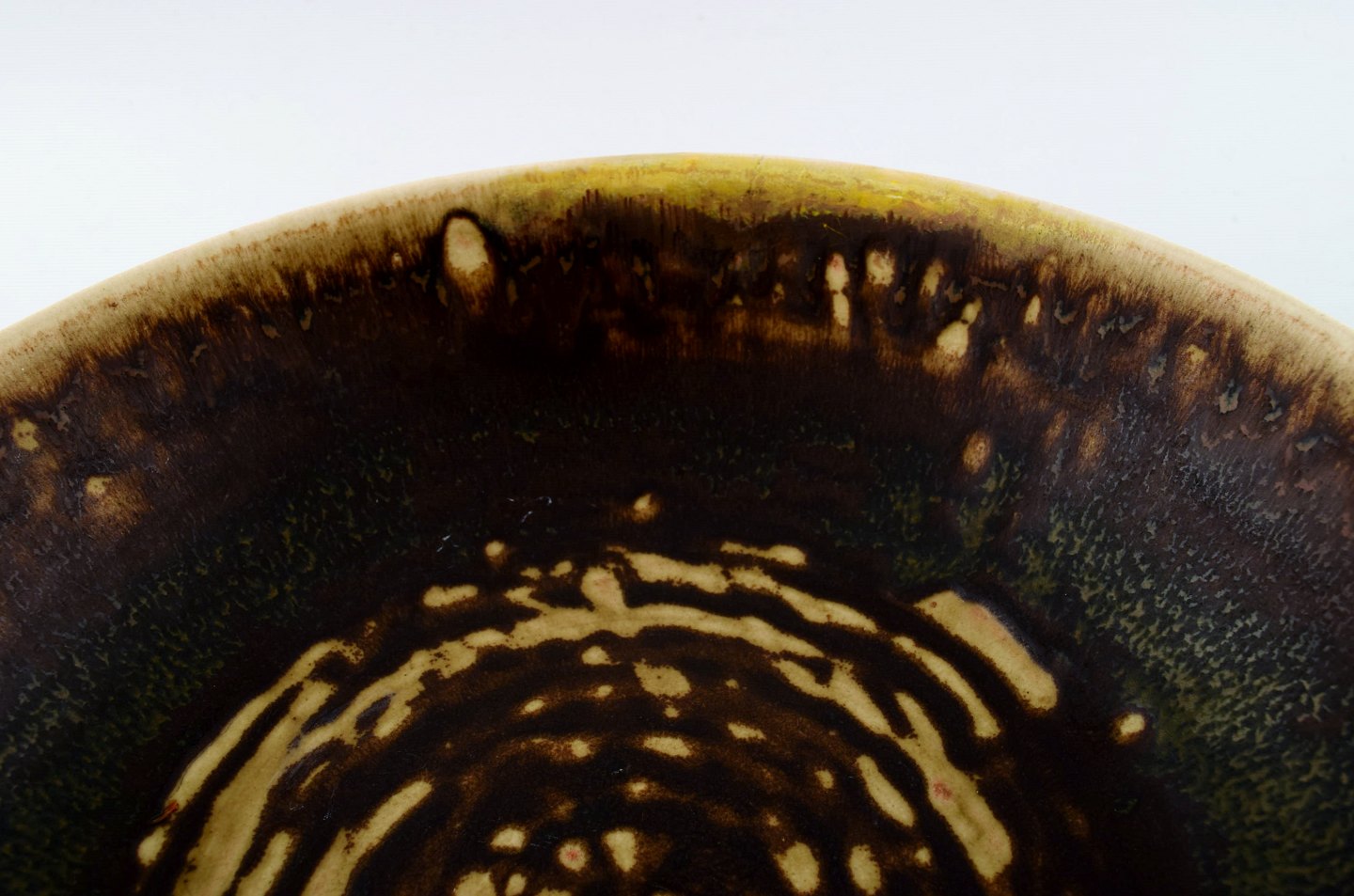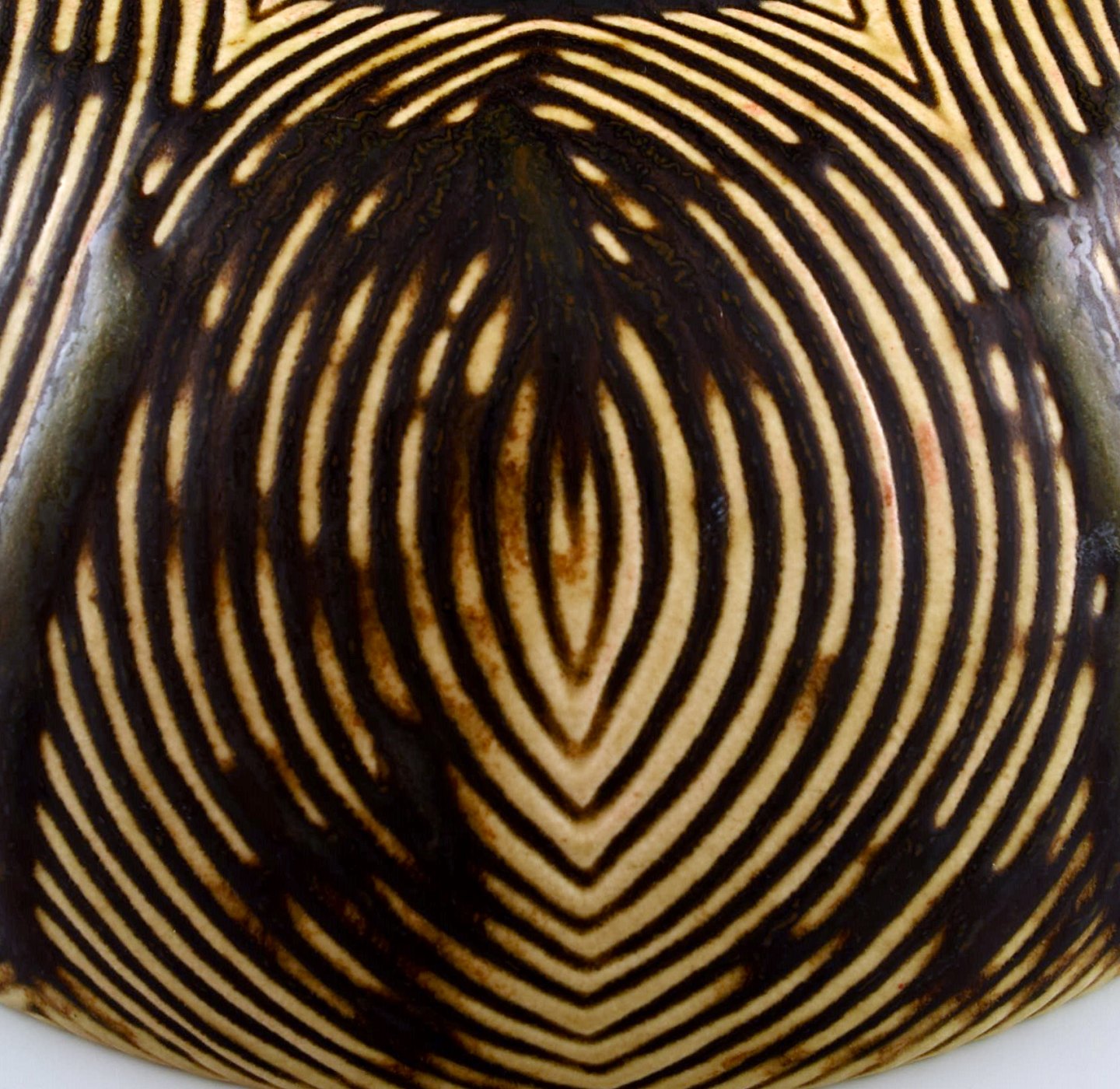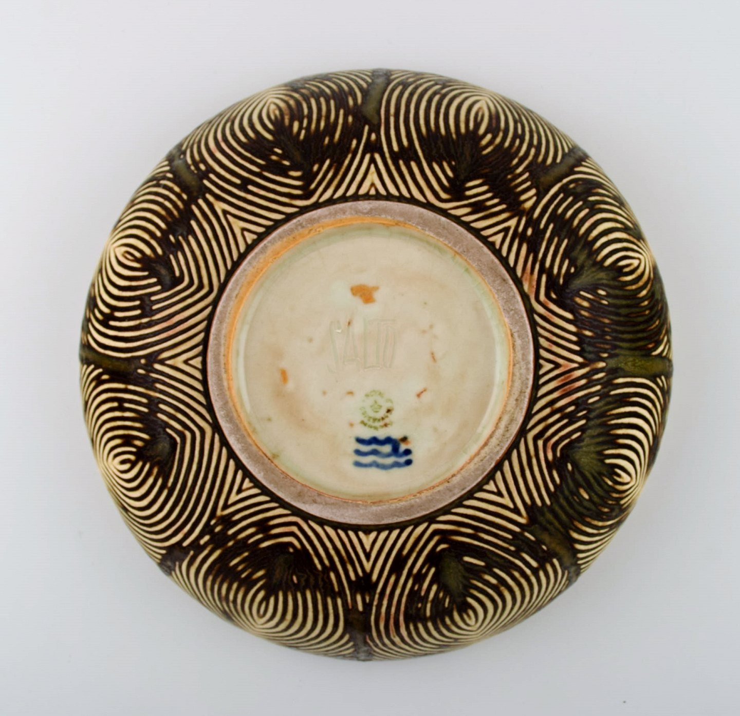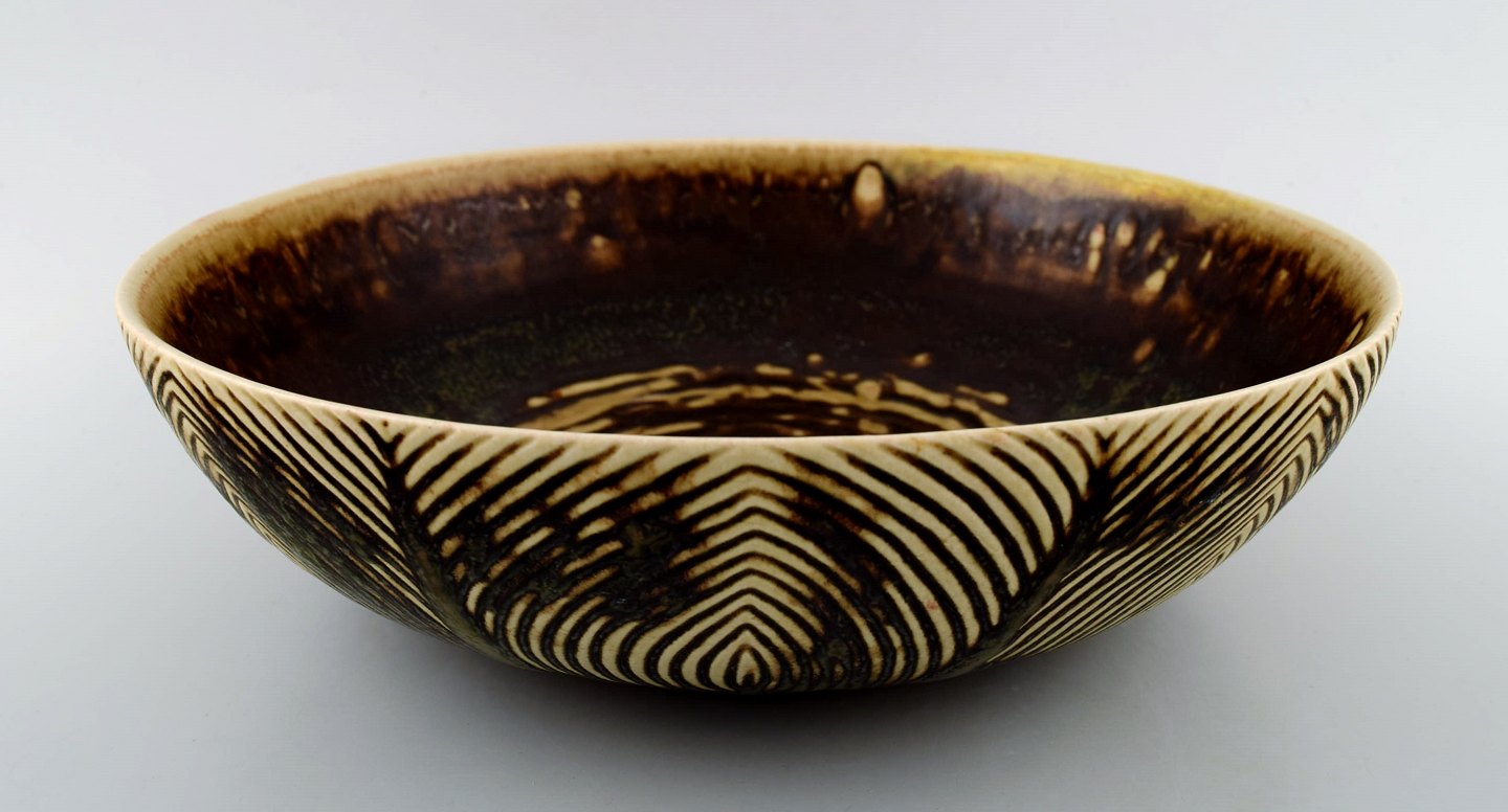 Axel Salto for Royal Copenhagen: Stor bordskål af stentøj, yderside modelleret med rillet mønster. Dekoreret med solfataraglasur.