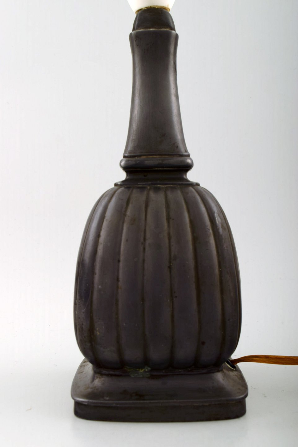 Just Andersen, bordlampe af patineret diskometal. Le Klint skærm. Stemplet monogram Just A., D 1353. Højde. inkl. skærmholder 43 cm. I god stand, brugspræg.
