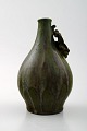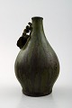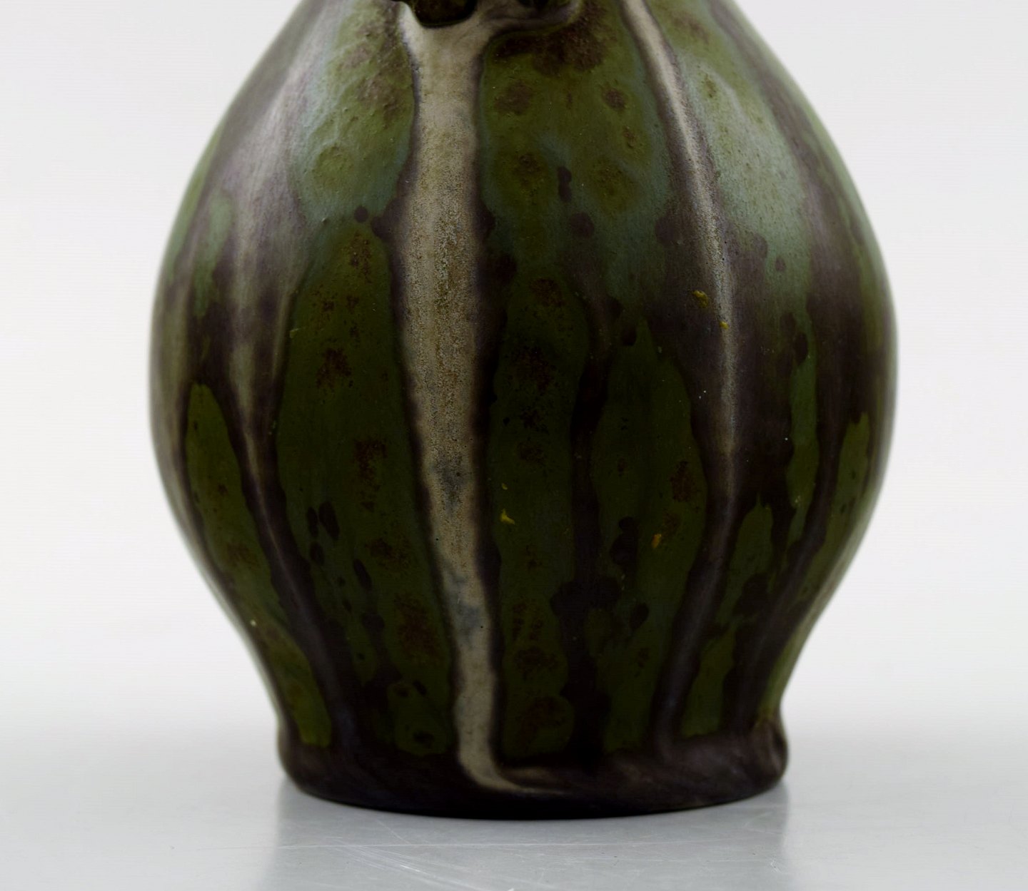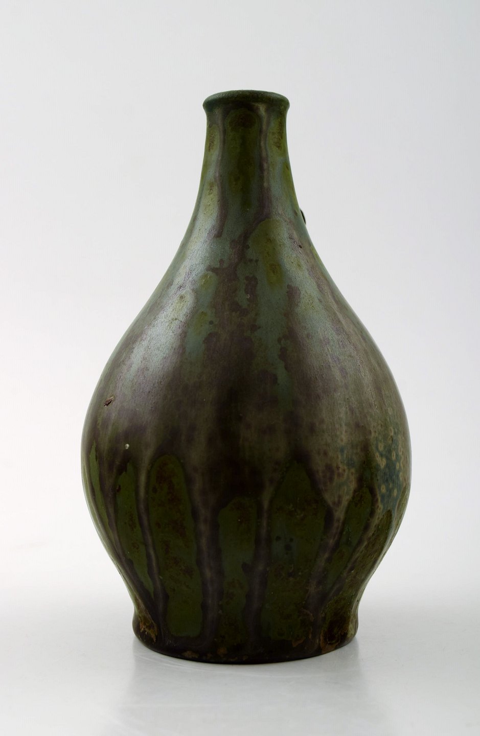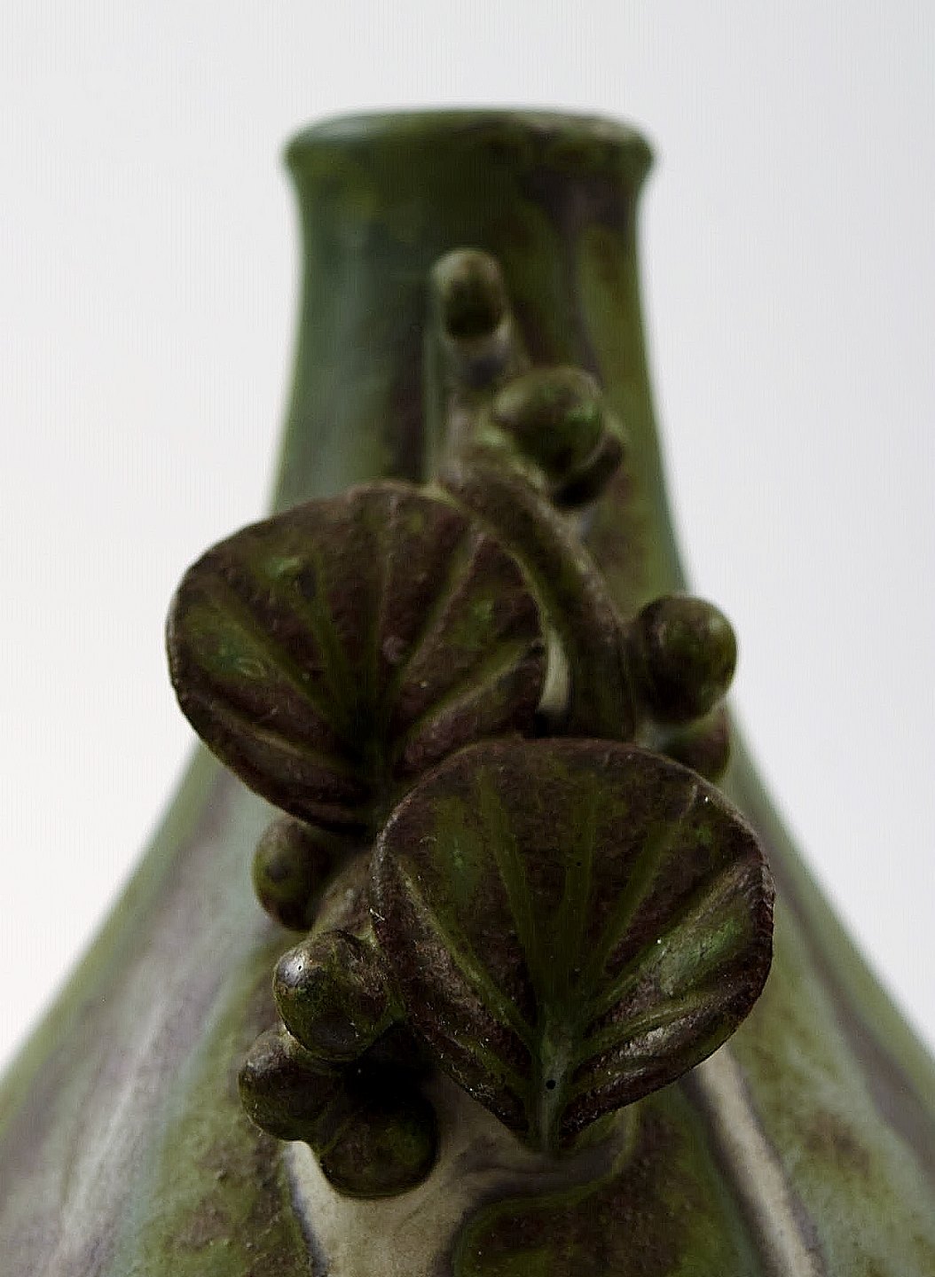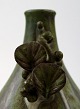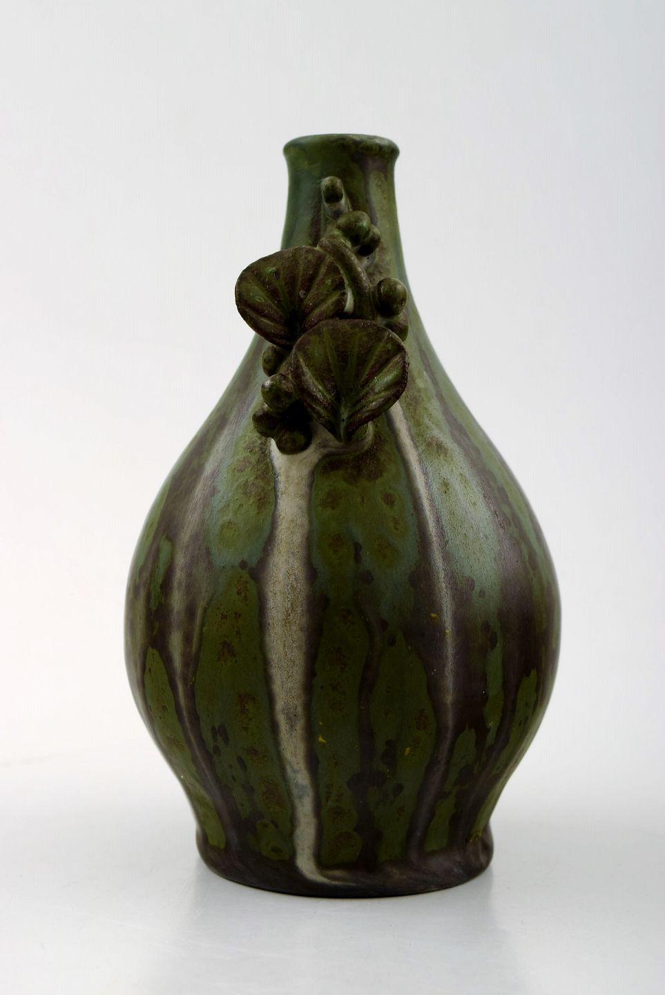 Arne Bang. Keramikvase med bladværk. Flot glasur i grønbrune nuancer. I perfekt stand. Måler: 14,5 cm. x 8,5 cm. Stemplet. AB 18.