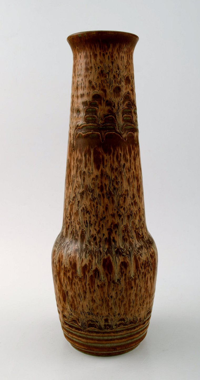 Stor Rörstrand/Rørstrand stentøjsvase af Gunnar Nylund. 28 cm. høj. Diameter 11 cm. I perfekt stand. Flot glasur i brune nuancer. 1. sortering. Stemplet.