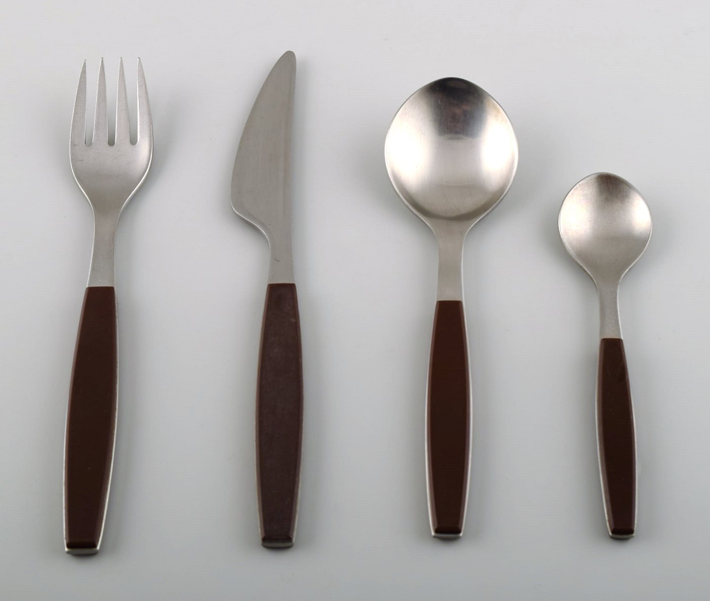 Komplet middagsservice til 6 p., Henning Koppel. Strata bestik af rustfrit stål og brun plast. Fremstillet hos Georg Jensen.
