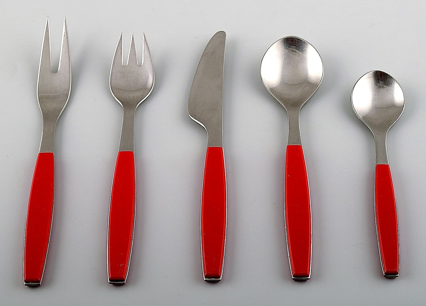 Complete service for 4 p., Henning Koppel. Strata cutlery from stainless steel and red plastic. Produced by Georg Jensen.