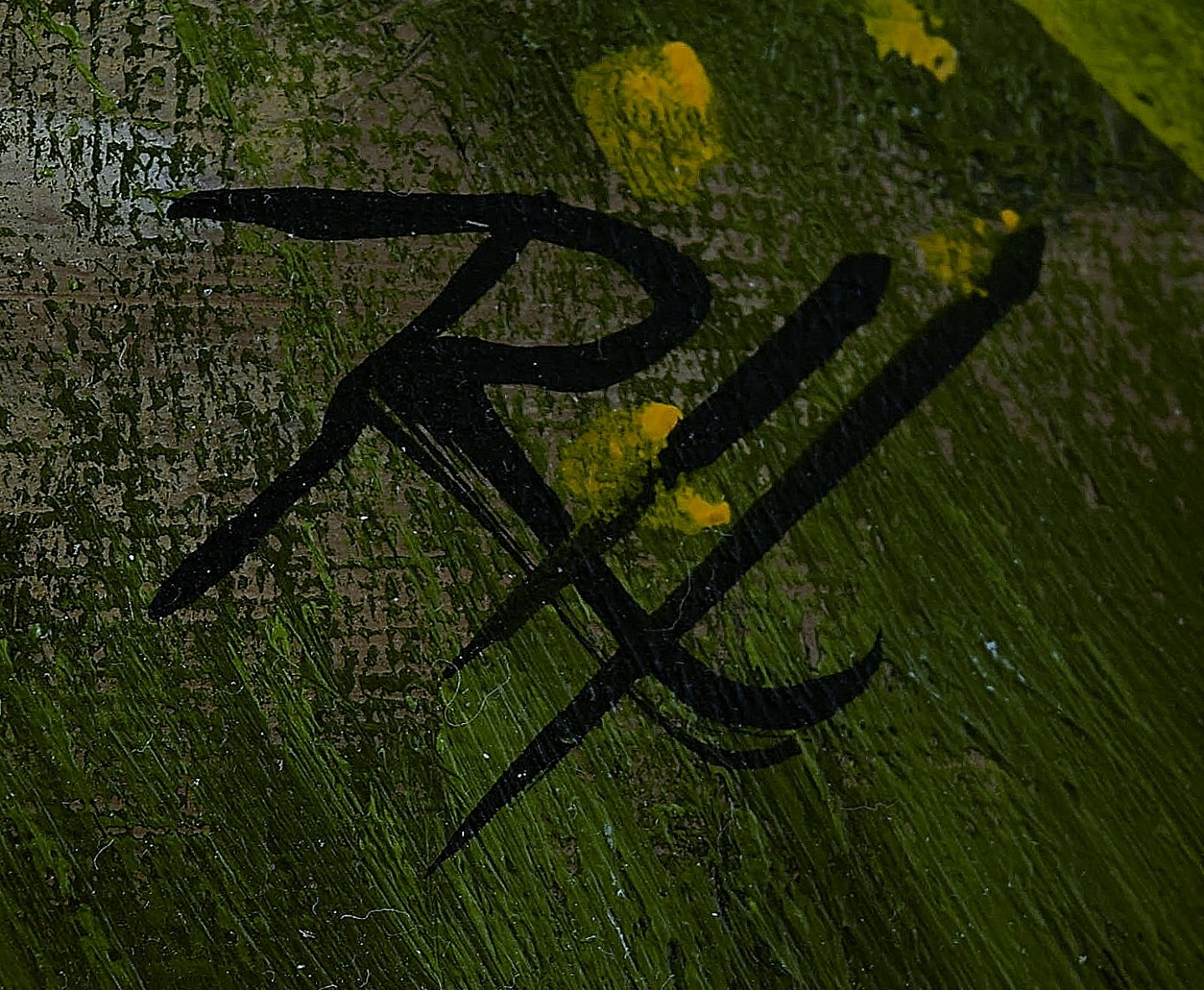 Olie på lærred, Roald Hansen (Født 1938) Idyllisk exteriør med stråtækt hus og høns på gårdspladsen. Måler 32 x 40 cm. Signeret RH. I perfekt stand. Guldrammen er 4,5 cm. bred og i perfekt stand.